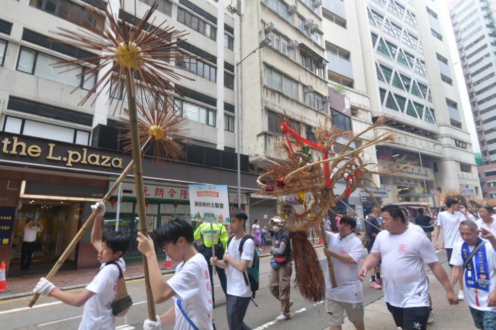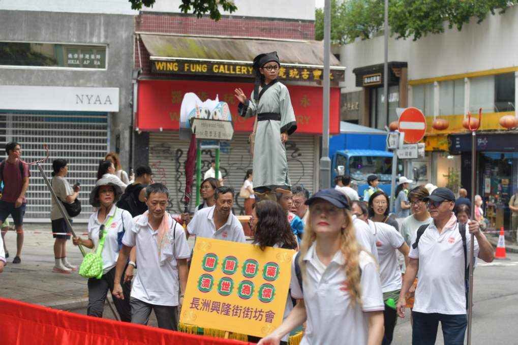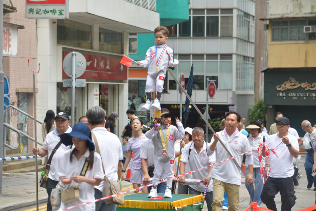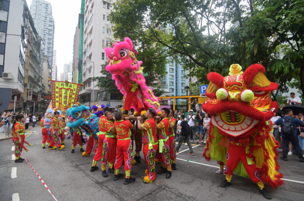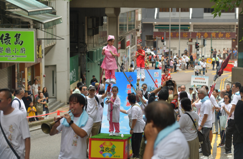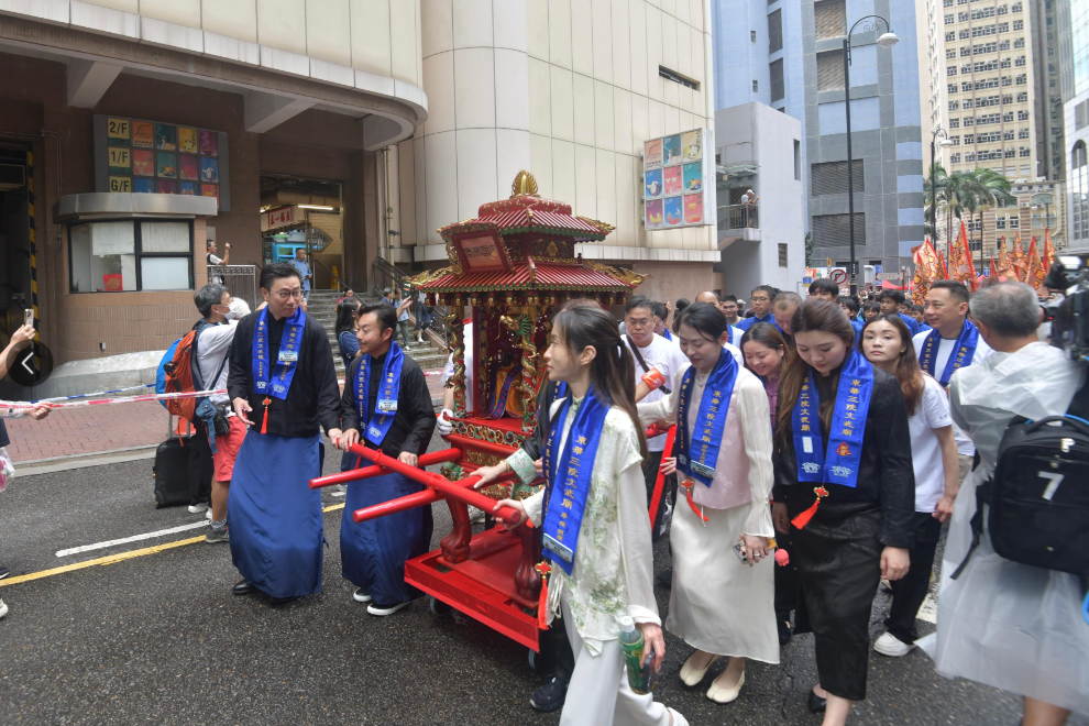 出巡隊伍約有500人,包括傳統(tǒng)紮作與舞龍技藝的百尺薄扶林火龍、承傳南獅與武藝功架的醒獅和舞麒麟,以及扮成神明出巡、盡顯民俗工藝的長洲飄色等極富本港非遺特色的隊伍,加上傳統(tǒng)廟宇儀仗、禮生、旗隊、廟宇及宗教文化隊伍等,沿途鑼鼓喧天,氣勢恢弘,吸引大批市民駐足拍照,感受濃厚的節(jié)慶氛圍。