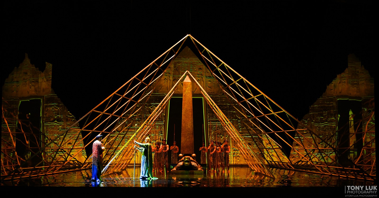 舞臺上閃耀著金光,燈光下還有藍(lán)色、紫色、綠色和紅色熠熠生輝,男主角渾厚透亮的聲音唱起「聖潔的阿依達(dá)」,一個(gè)大三角夢幻般立體舞臺設(shè)計(jì),用藝術(shù)還原了古埃及的背景,把觀眾深深吸引。