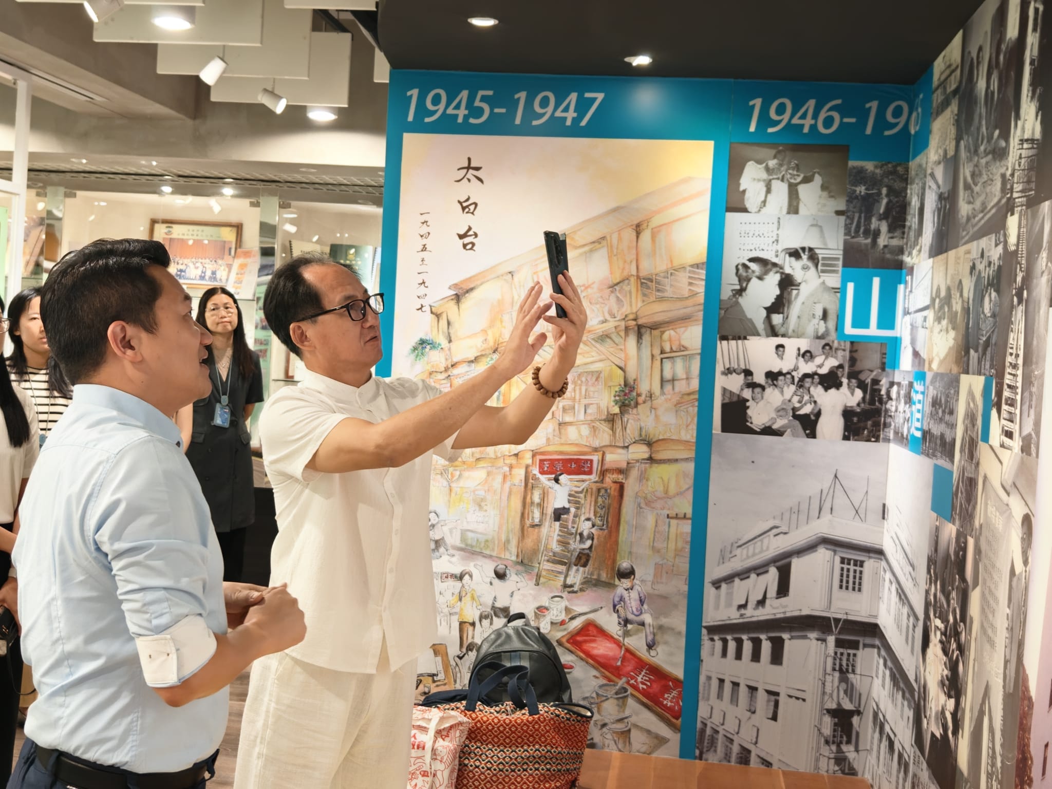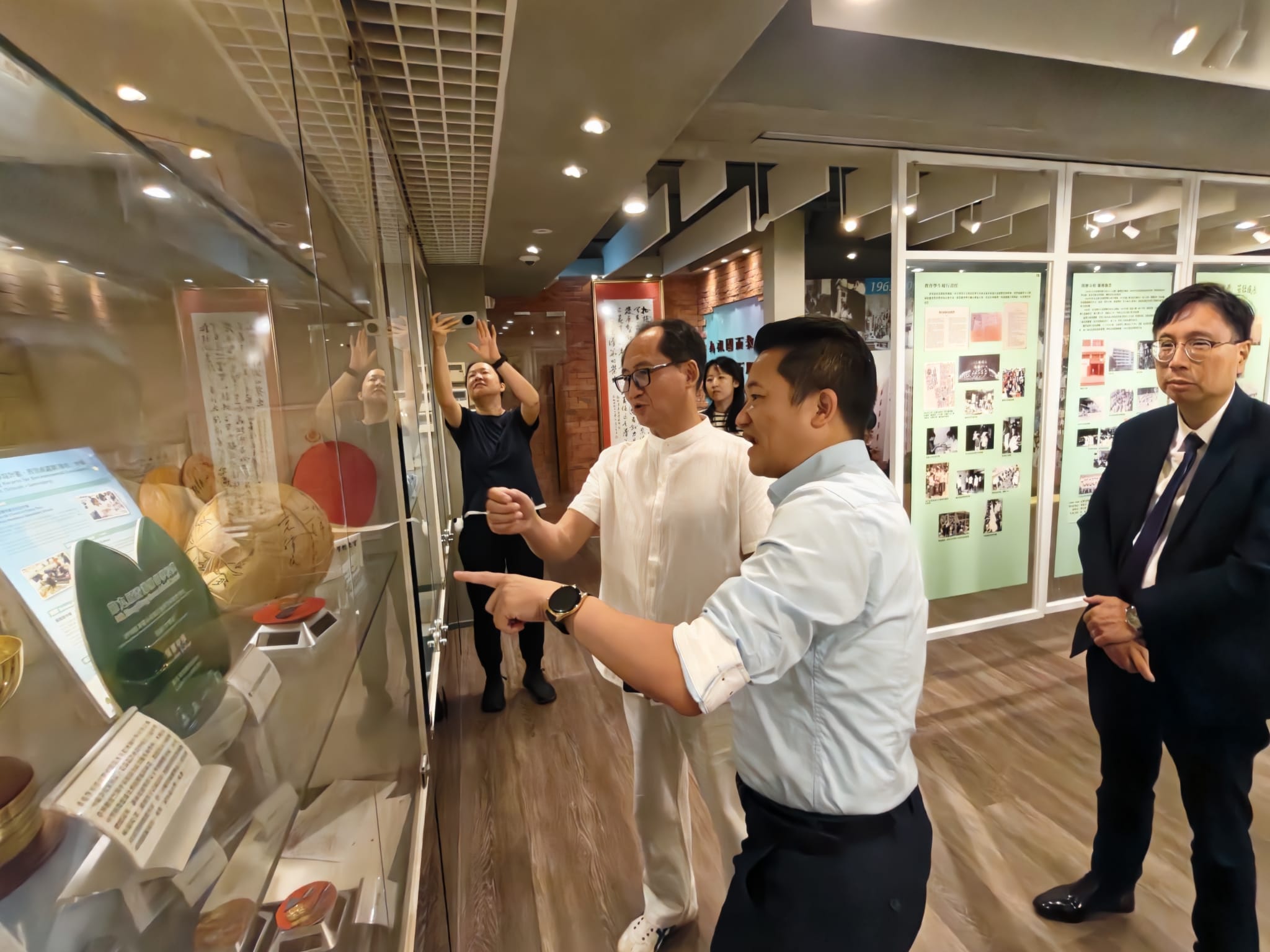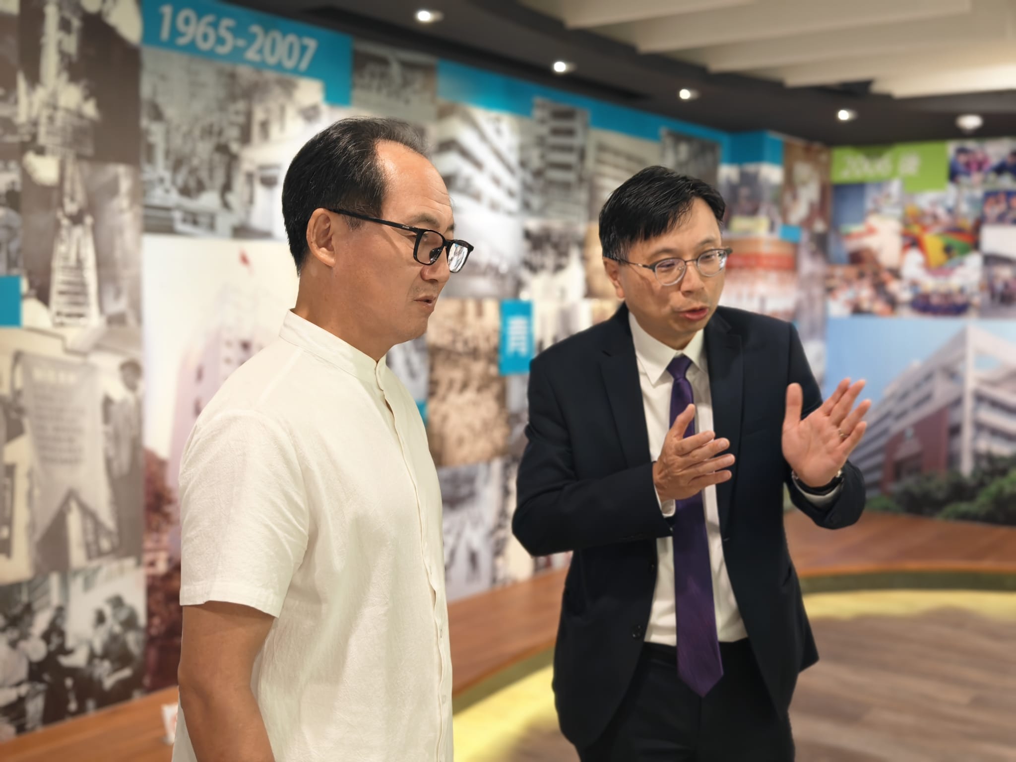 漢華中學(xué)創(chuàng)立於1945 年12月,是首間在香港創(chuàng)辦的傳統(tǒng)愛國學(xué)校,今年迎來80周年慶典。分享會開始前,校長關(guān)頴斌與多名老師陪同衣向東參觀了該校的校史室。