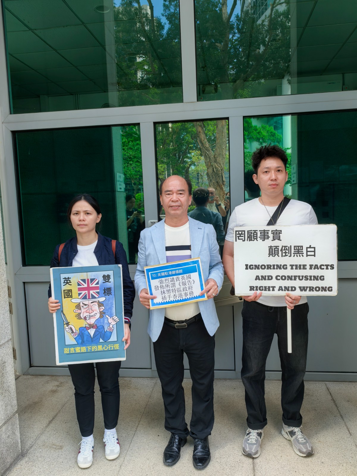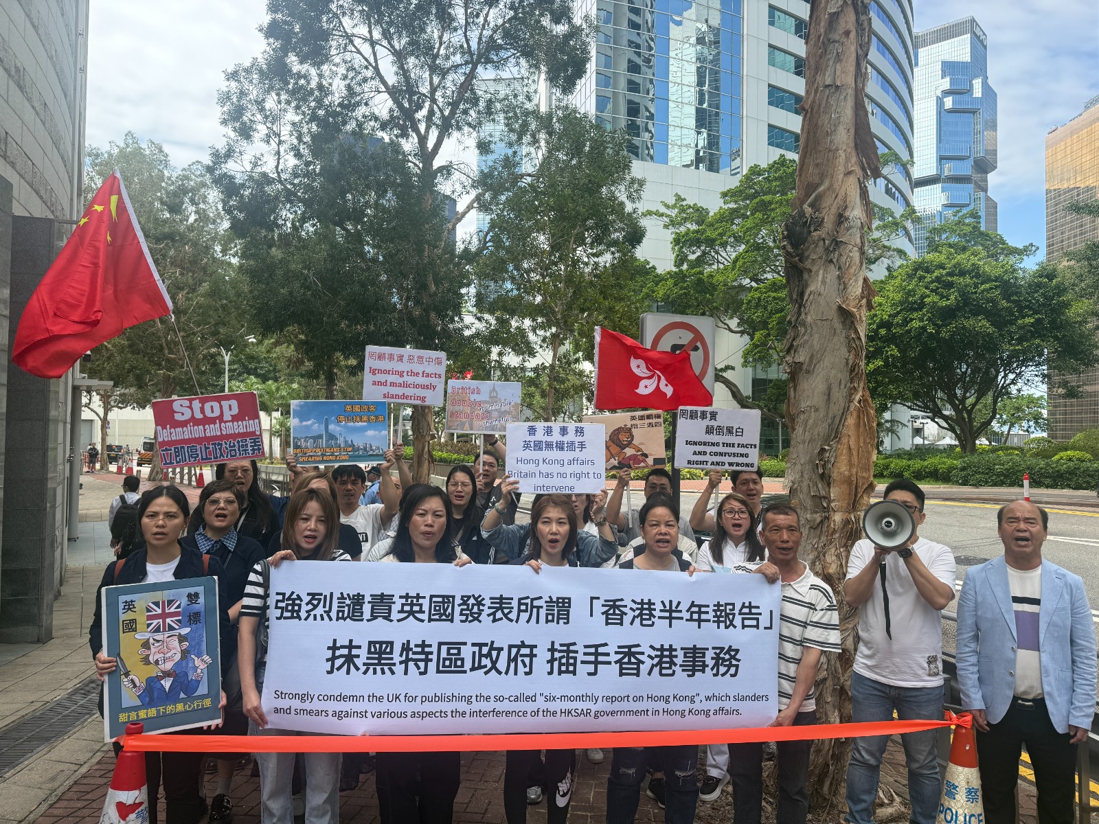 他們拉起寫著「強烈譴責英國發(fā)表所謂『香港半年報告』 抹黑特區(qū)政府插手香港事務(wù)」的橫額,手持「英國無權(quán)干涉香港」「罔顧事實顛倒黑白」等標語,在英國駐香港總領(lǐng)事館前高叫口號抗議。