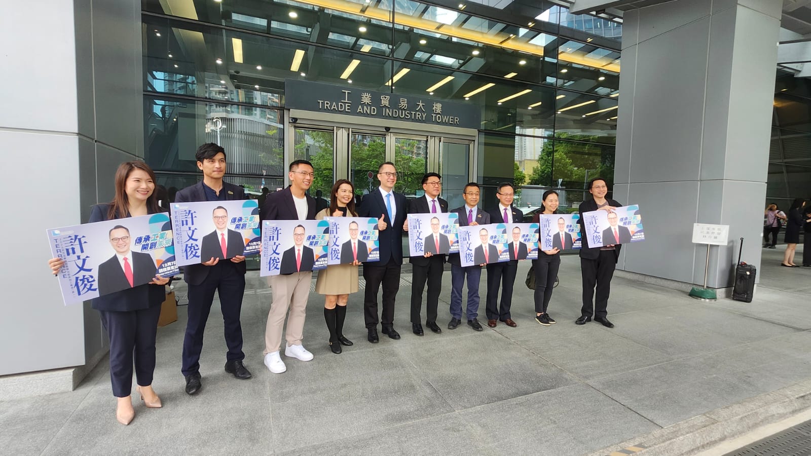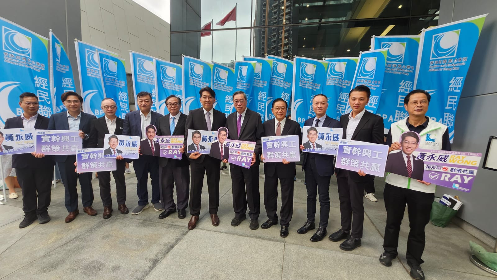 黃永威及許文俊在報名前,在經(jīng)民聯(lián)監(jiān)事會主席林建岳、經(jīng)民聯(lián)榮譽主席梁君彥、經(jīng)民聯(lián)主席盧偉國、經(jīng)民聯(lián)副主席林健鋒、經(jīng)民聯(lián)副主席吳永嘉、經(jīng)民聯(lián)監(jiān)事會副主席胡劍江及香港工業(yè)總會主席林世豪陪同下出席造勢活動。