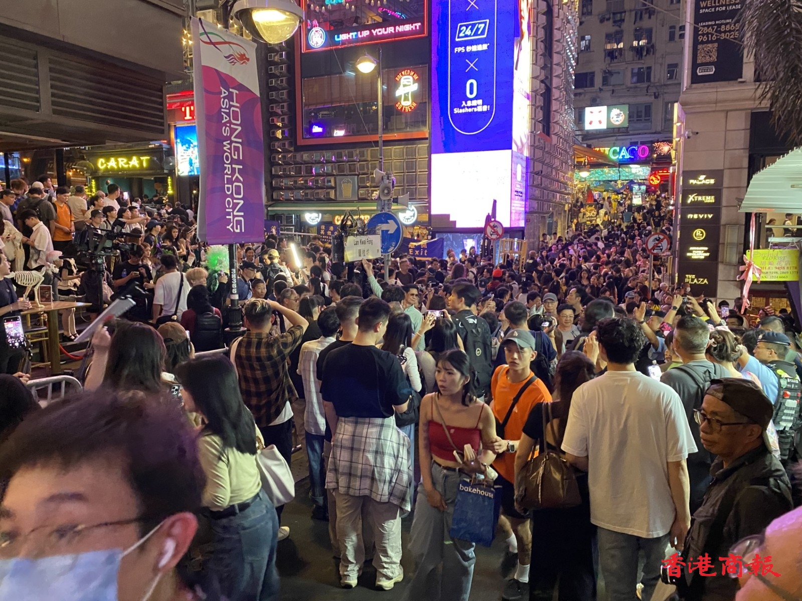 整晚的蘭桂坊只能單方向而行,警察不時(shí)呼籲:「拍完照就要繼續(xù)前行,不要阻塞通道?!?/span>