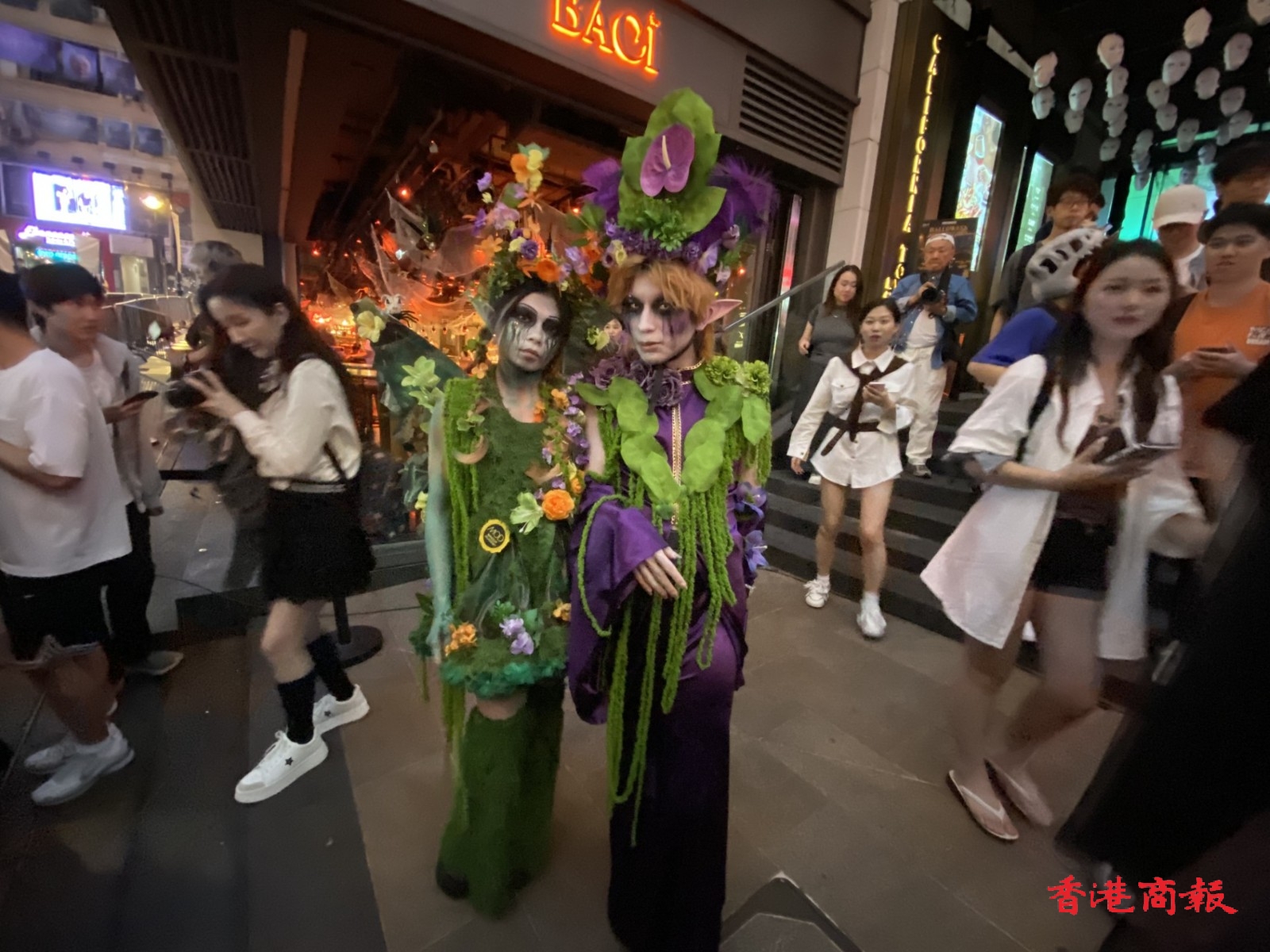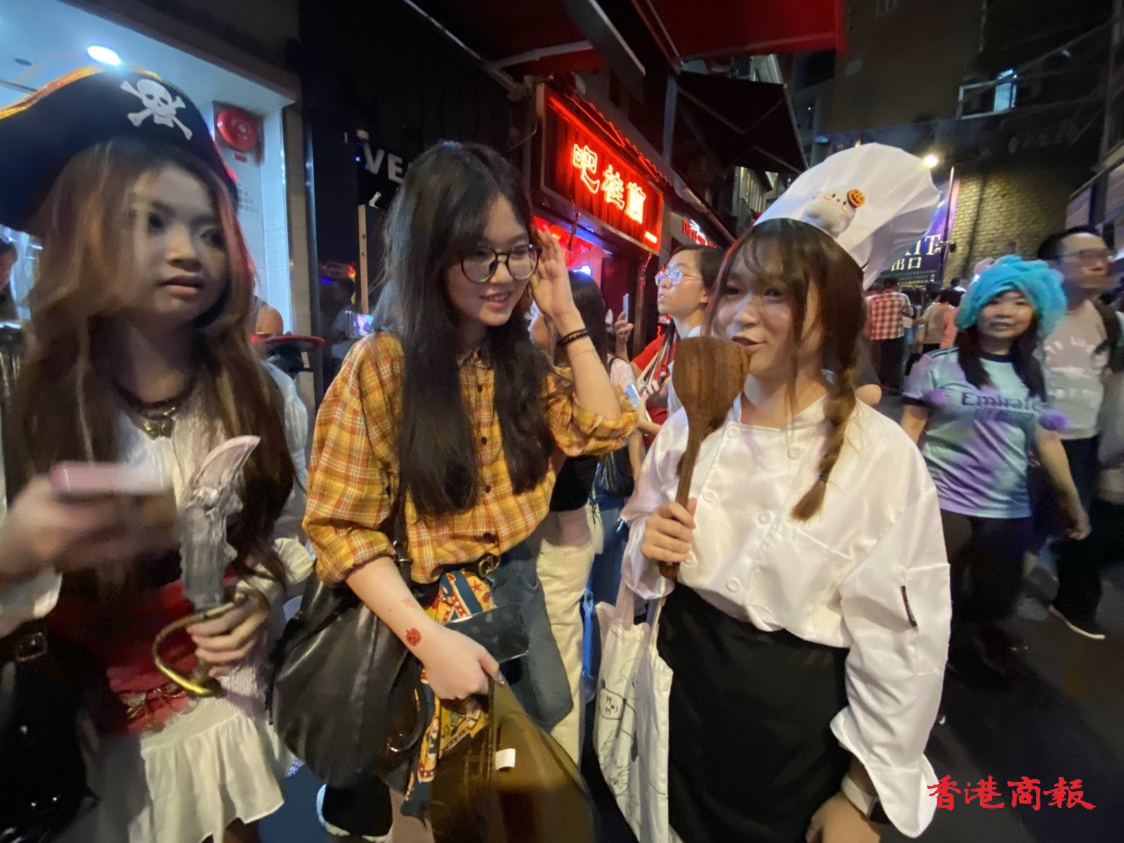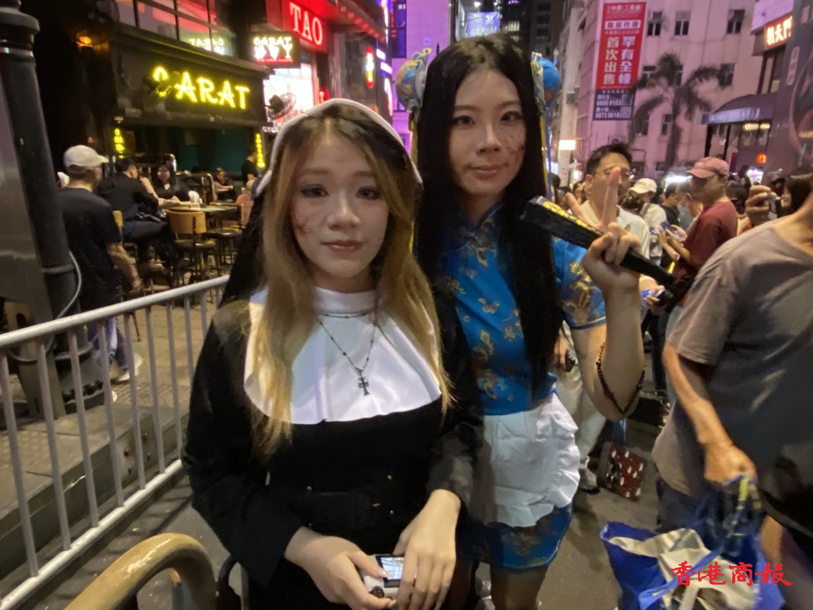 5名教育大學(xué)內(nèi)地碩士生悉心打扮前來(lái),黃小姐說(shuō):「第一次來(lái)蘭桂坊,因?yàn)樯闲瞧谛〖t書介紹這裏很有萬(wàn)聖節(jié)氛圍,所以我們專程來(lái)體會(huì)一下,在內(nèi)地從未有過(guò)這麼強(qiáng)烈的萬(wàn)聖節(jié)體驗(yàn),衣服和道具都是上星期網(wǎng)上買的,花費(fèi)數(shù)百元,不過(guò)現(xiàn)場(chǎng)人太多,所有酒吧都插針不入,要往上環(huán)方向轉(zhuǎn)移才有機(jī)會(huì)找到地方飲酒?!?/p>