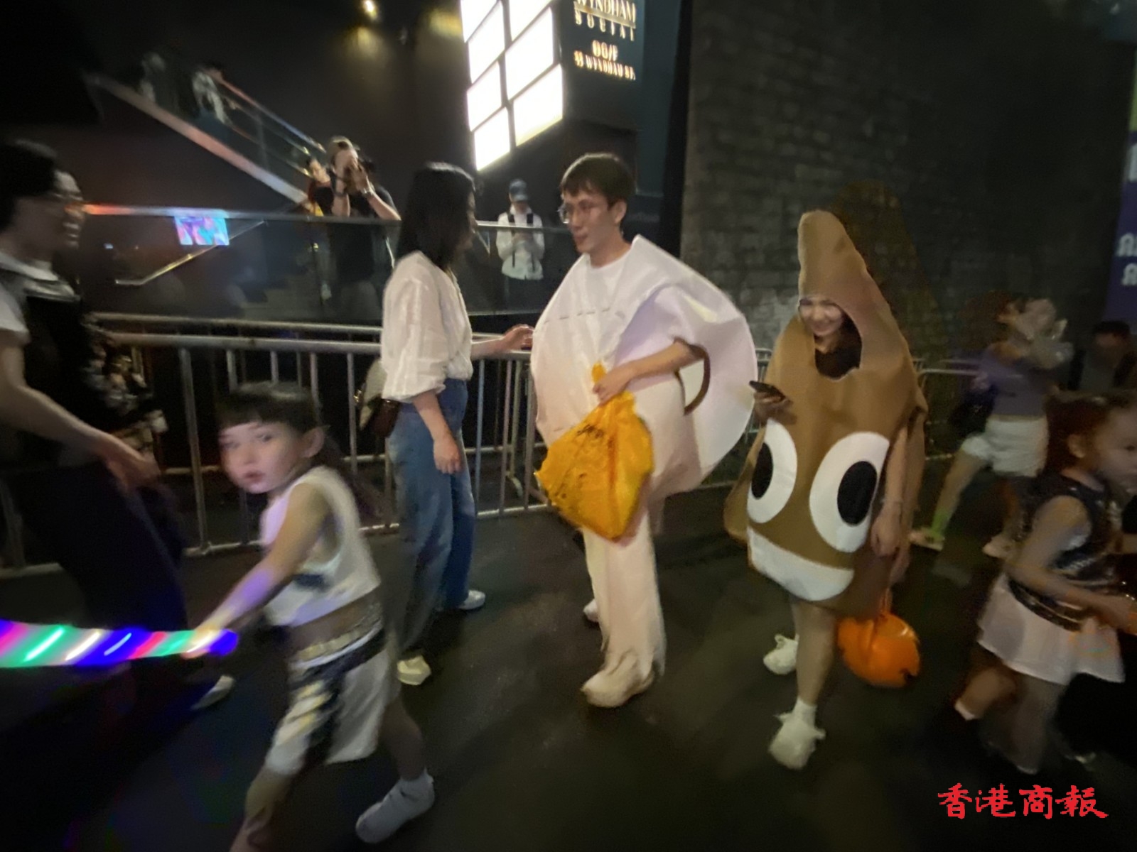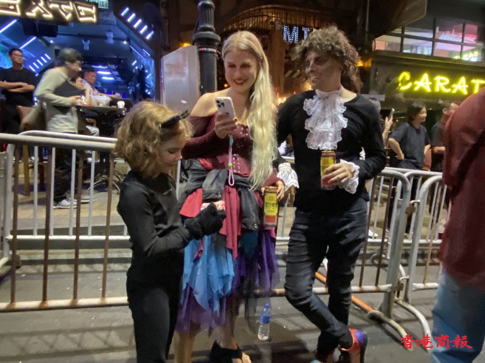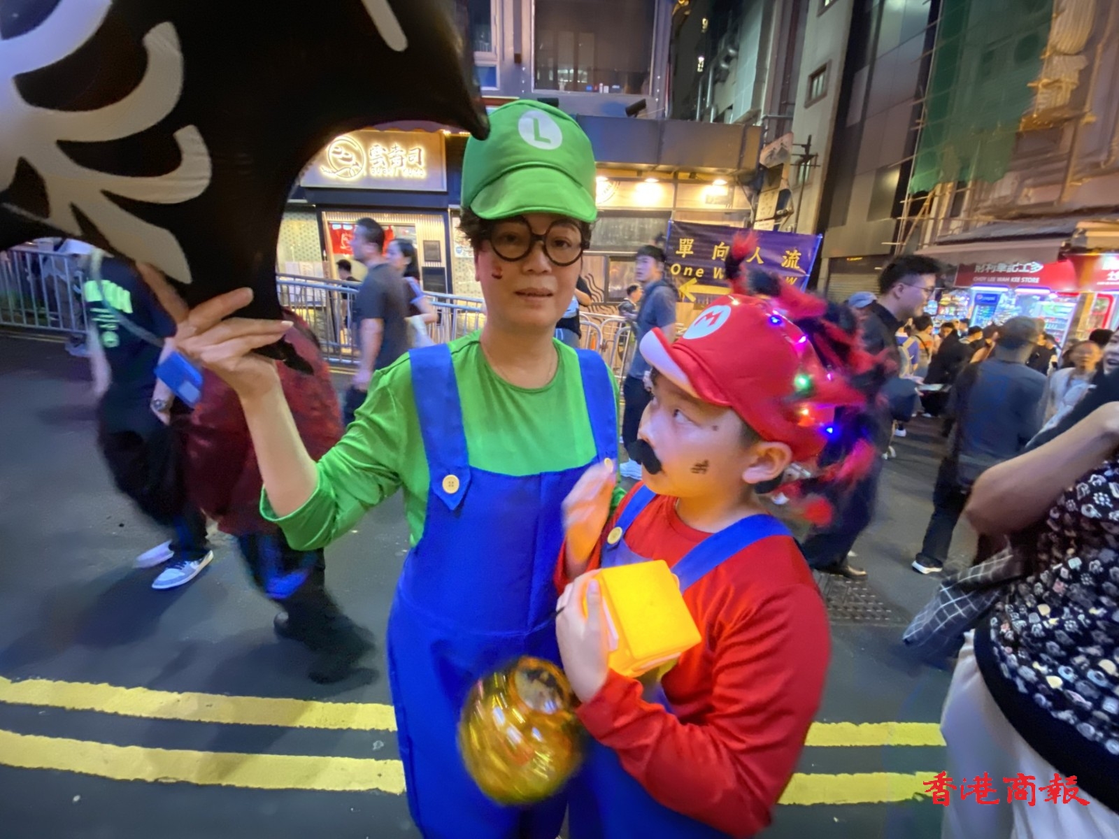來(lái)自沙田的黎女士與一對(duì)子女作「孖寶兄弟」打扮而來(lái)。她說(shuō):「我們是第二年來(lái)玩,因?yàn)槲?歲的兒子喜歡,所以陪他一齊扮鬼扮怪,之後會(huì)在蘭桂坊找間樓上西餐廳晚飯。」