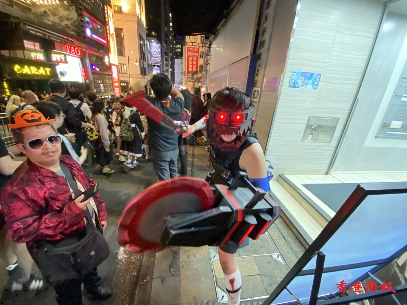 16歲的中六學(xué)生李同學(xué)第四年來(lái)蘭桂坊,今年打扮為手遊角色「未來(lái)戰(zhàn)士」前來(lái),製作須時(shí)3個(gè)星期,成本500多元。他說(shuō):「以前爸爸陪我來(lái),今年是第二年自己一個(gè)來(lái),不過(guò)爸爸規(guī)定我9點(diǎn)前要走,來(lái)到有很多人找我合照,很有成功感?!?/p>