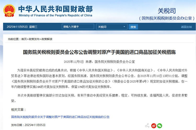 為落實中美經(jīng)貿(mào)磋商達成的成果共識,根據(jù)《中華人民共和國關(guān)稅法》、《中華人民共和國海關(guān)法》、《中華人民共和國對外貿(mào)易法》等法律法規(guī)和國際法基本原則,經(jīng)國務(wù)院批準,國務(wù)院關(guān)稅稅則委員會公布公告,自2025年11月10日13時01分起,調(diào)整《國務(wù)院關(guān)稅稅則委員會關(guān)於對原產(chǎn)於美國的進口商品加徵關(guān)稅的公告》(稅委會公告2025年第4號)規(guī)定的加徵關(guān)稅措施,在一年內(nèi)繼續(xù)暫停實施24%的對美加徵關(guān)稅稅率,保留10%的對美加徵關(guān)稅稅率。