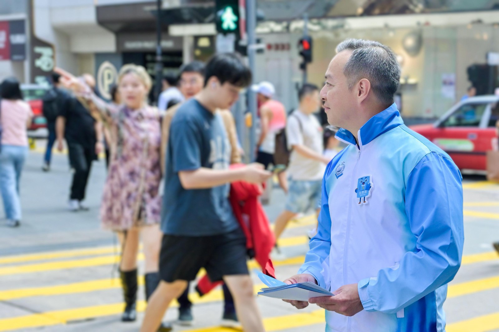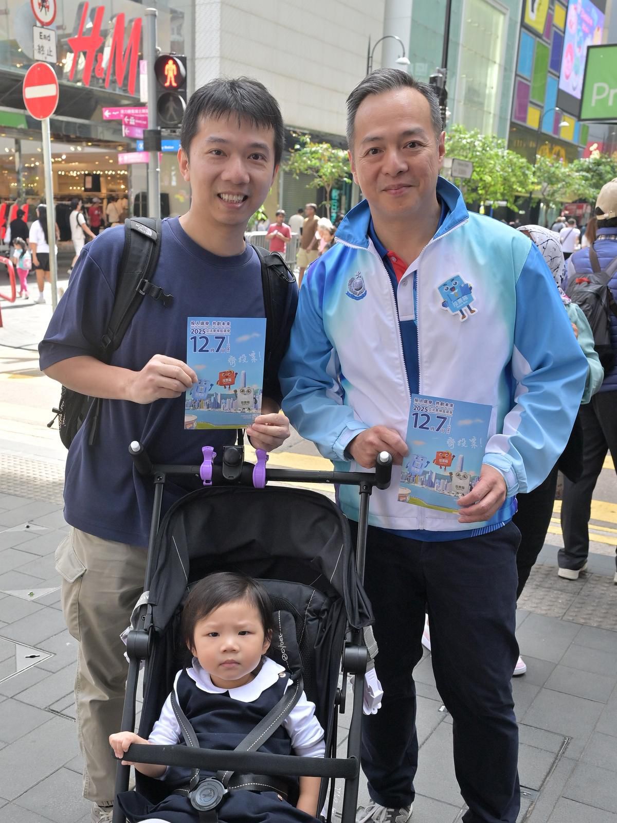 頂圖:警務處處長周一鳴聯(lián)同一眾警員、灣仔警區(qū)少年警訊及耆樂警訊會員到銅鑼灣派發(fā)傳單,呼籲選民踴躍投票。