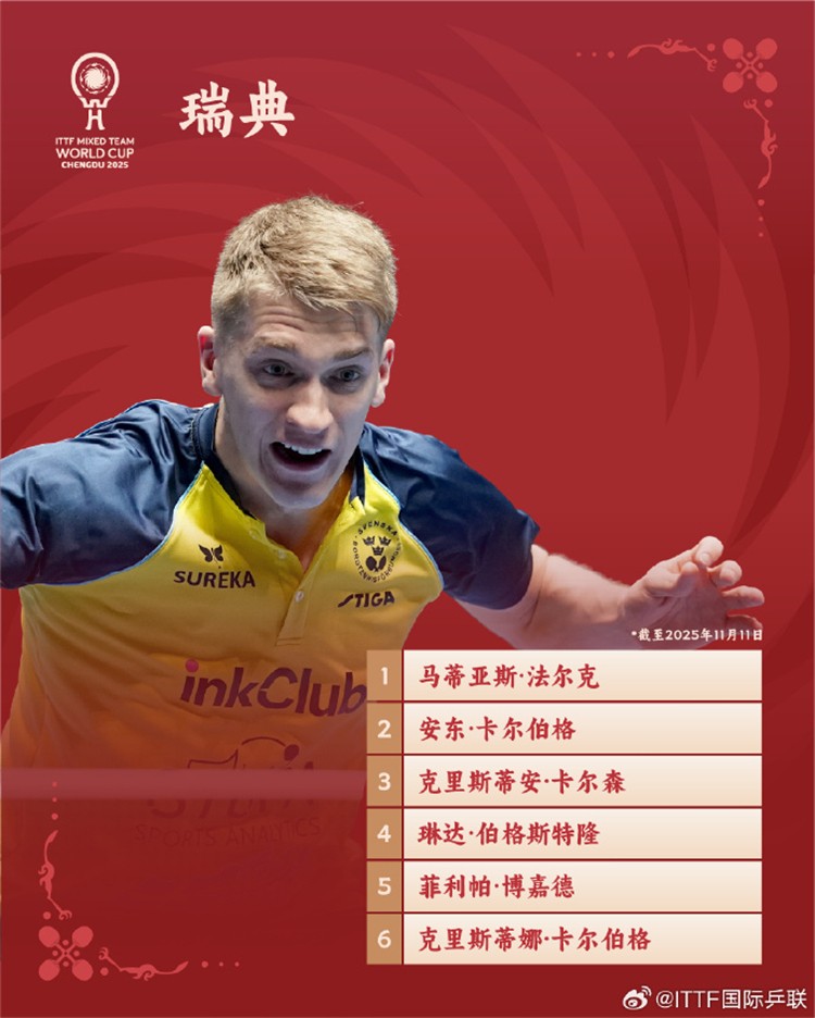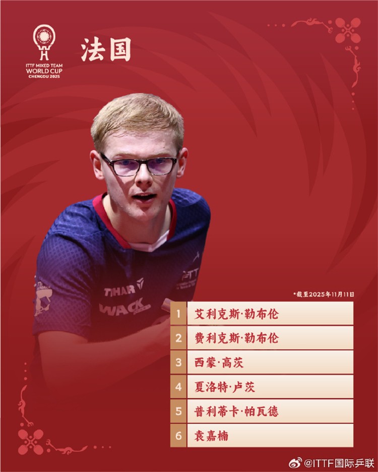 11月12日,國際乒聯(lián)公布了2025乒乓球混合團(tuán)體世界盃的參賽名單。本屆賽事冠軍隊(duì)伍積分升至2500分。中國隊(duì)的參賽陣容為:王楚欽、林詩棟、梁靖崑、徐瑛彬、孫穎莎、王曼昱、王藝迪、蒯曼。