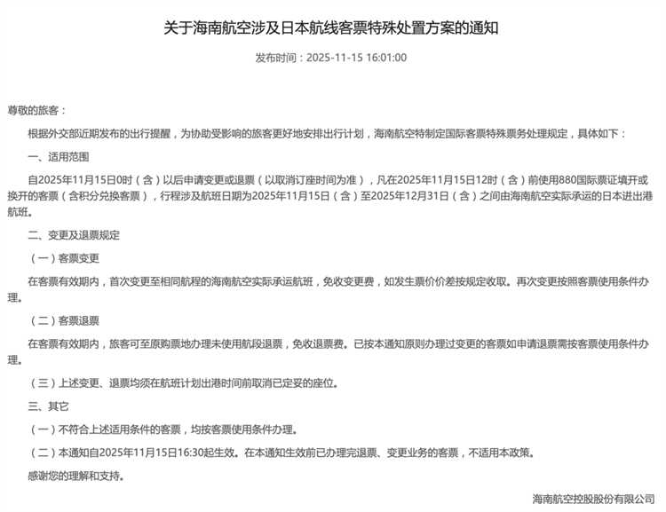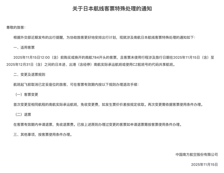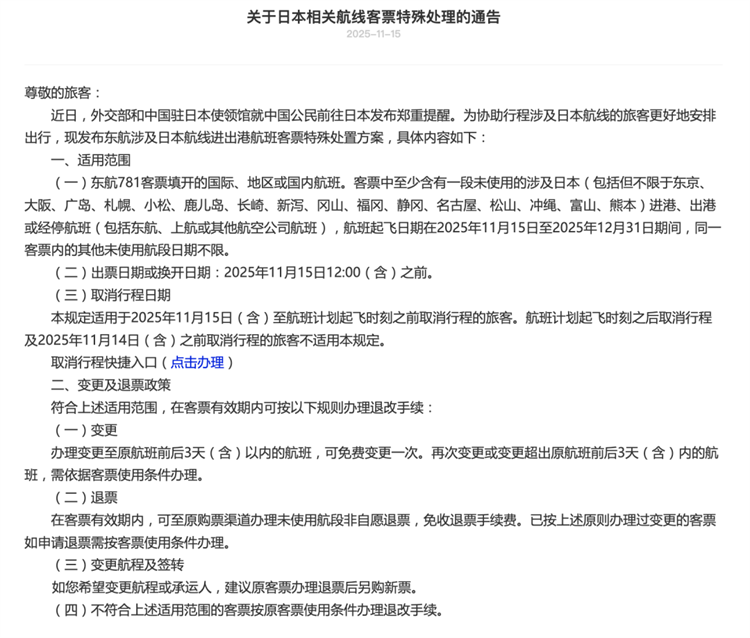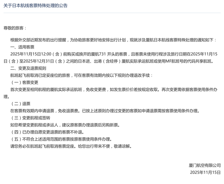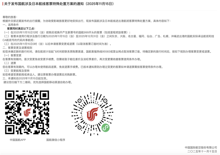 15日,國航、南航、東航、海航、川航、廈航等航司相繼發(fā)布通知,對於出行日期在12月31日之前,涉及日本相關航線且符合相關條件的客票,可予以免費退改處理。