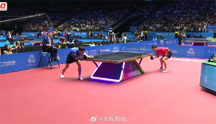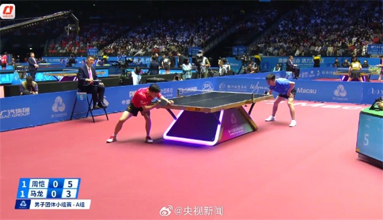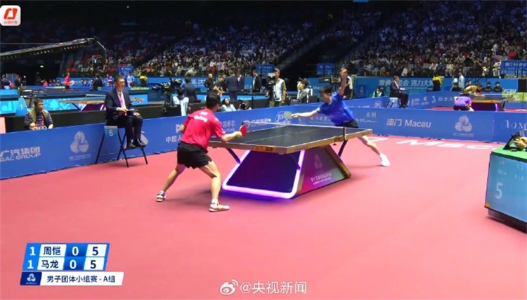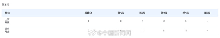 第十五屆全運會乒乓球男團小組賽A組比賽,北京隊對上上海隊。第三盤比賽中,北京隊馬龍戰(zhàn)勝上海隊周愷。