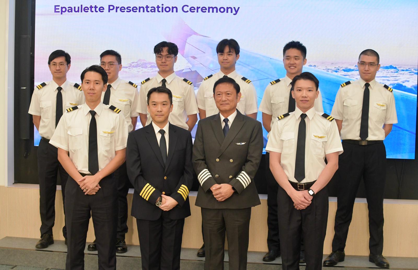 八位二副機師和周智衡(前排左二)飛行訓(xùn)練及航空工程培訓(xùn)中心總監(jiān)葉欣鴻(前排右二)在記者會上合影。