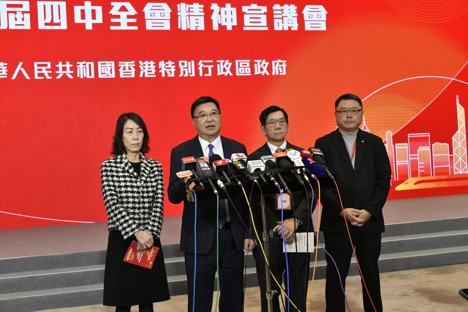 應(yīng)香港特別行政區(qū)政府請求,經(jīng)中央批準(zhǔn),中央港澳工作辦公室、國務(wù)院港澳事務(wù)辦公室邀請中央宣講團(tuán)成員,中國科學(xué)院院長、黨組書記侯建國和中央宣講團(tuán)成員,中央財經(jīng)委員會辦公室副主任、中央農(nóng)村工作領(lǐng)導(dǎo)小組辦公室副主任祝衛(wèi)東來港宣講中共二十屆四中全會精神。特區(qū)政府今日(25日)上午在政府總部舉行宣講會,向社會各界人士宣講中共二十屆四中全會精神。在宣講會後,全國人大常委會香港基本法委員會副主任黃玉山、香港科技園公司董事局主席查毅超、憲法和香港基本法推介聯(lián)席會議主席容永祺、全國政協(xié)委員楊莉珊接受傳媒採訪。