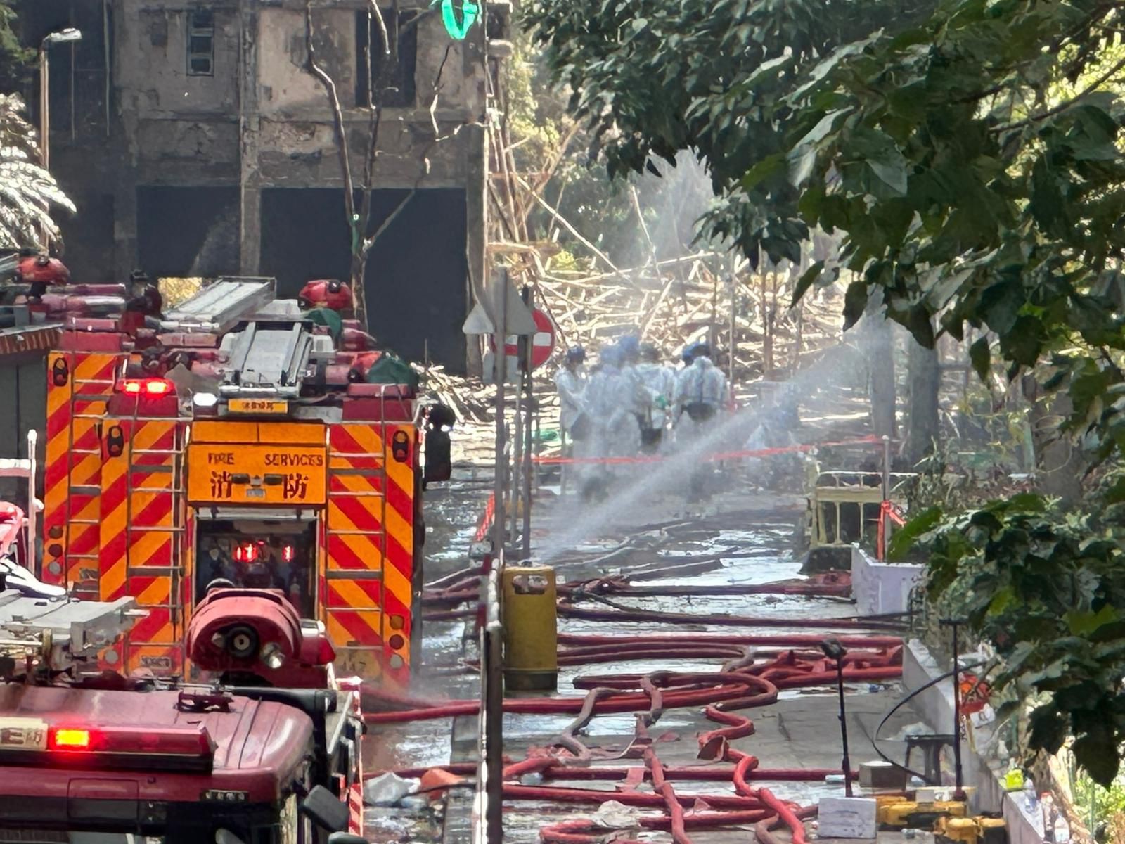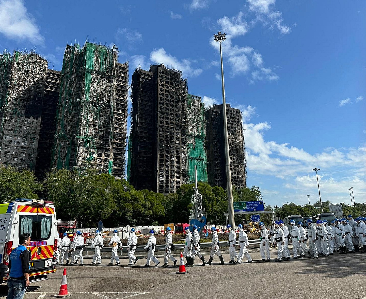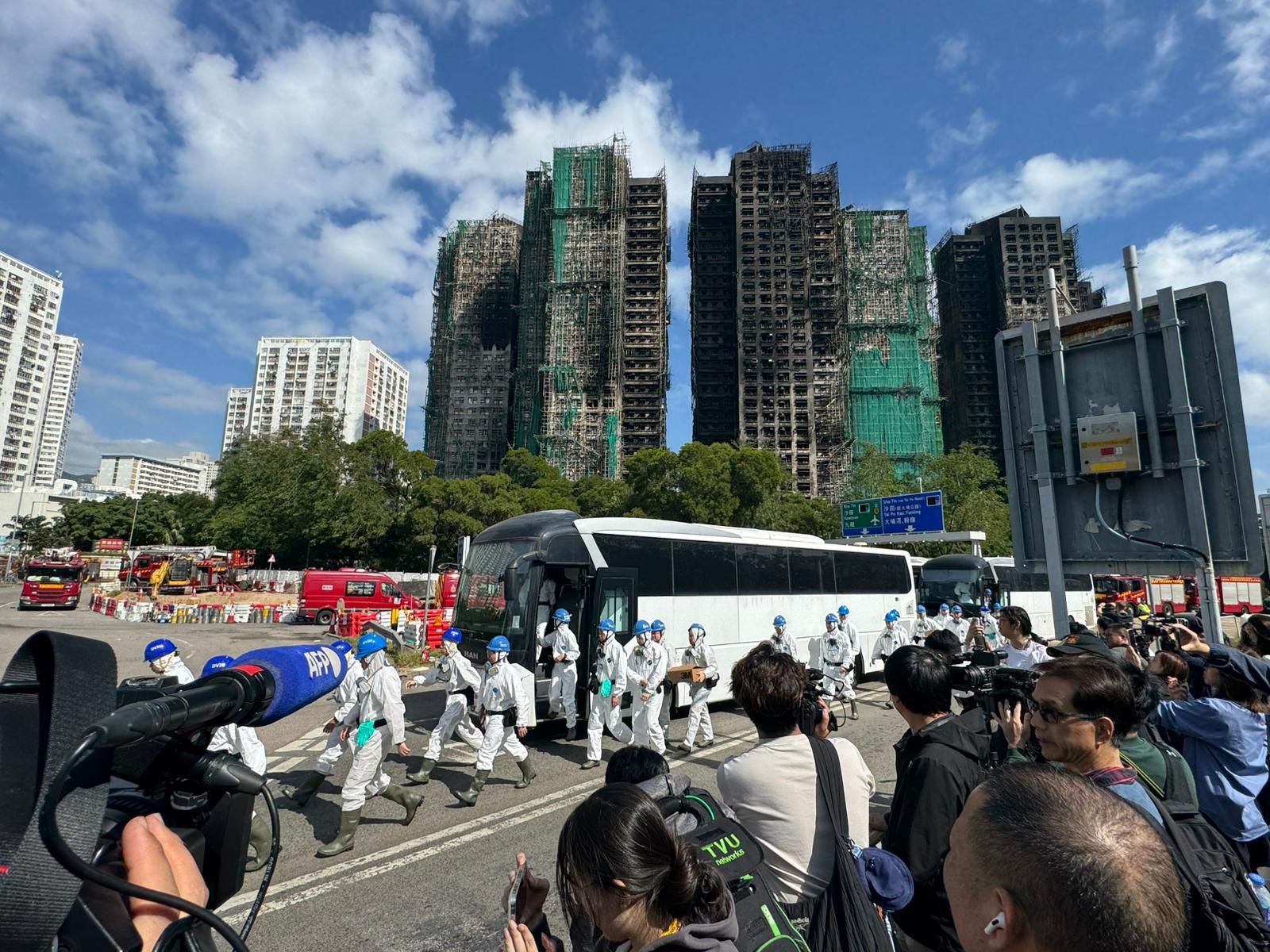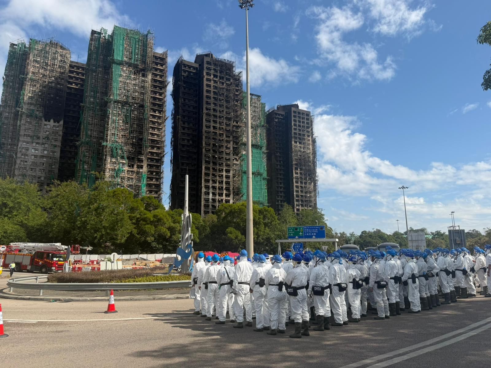 今日(29日)中午,警方災(zāi)難遇害者辨認(rèn)組(DVIU)逾百名人員,穿著保護(hù)衣物並帶同裝備,乘坐警車到達(dá)大埔宏福苑大火現(xiàn)場搜索遺體。人員在屋苑對開迴旋處落車,魚貫進(jìn)入火場搜查。