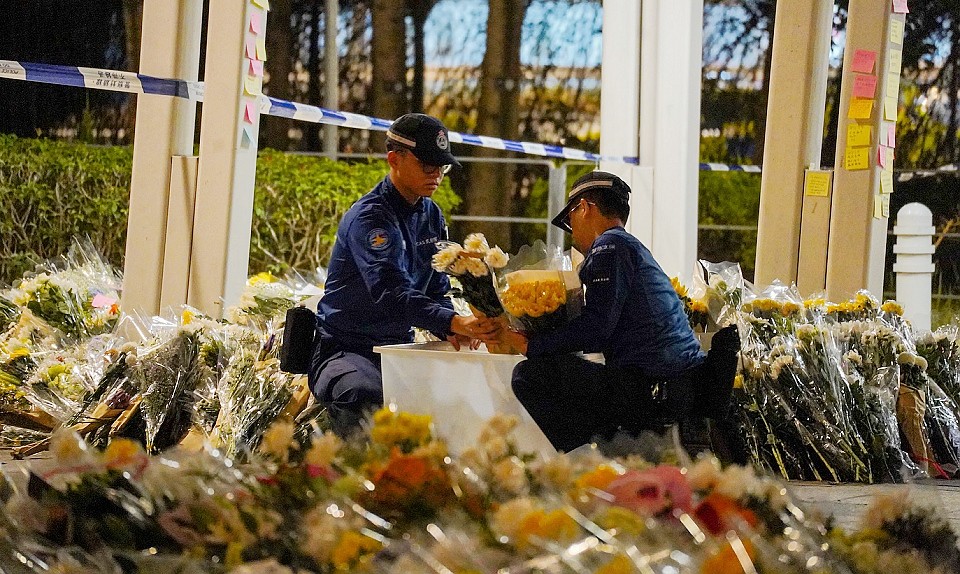大埔宏福苑五級大火後,大批市民攜鮮花到現(xiàn)場悼念,火場對開的公園連日來有大量花束?,F(xiàn)場的民安隊隊員除維持秩序外,亦收集市民置於地上作悼念的鮮花,並按花的大小,小心翼翼地放進膠箱,重置於不遠處的警方防線內。