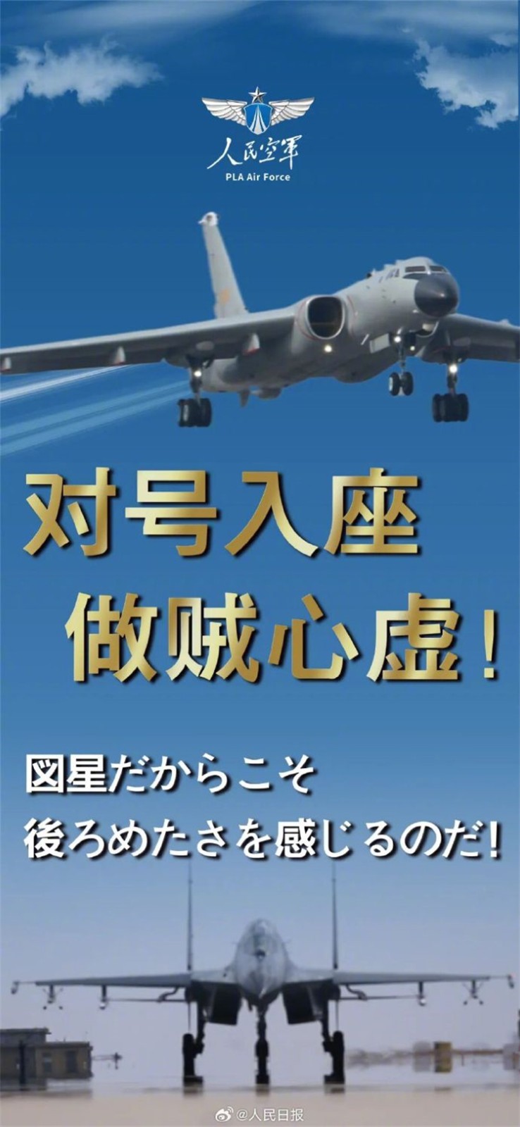 今日20時(shí)27分,人民空軍在社交媒體賬號(hào)發(fā)布中日雙語(yǔ)海報(bào)《大驚小怪,認(rèn)清常態(tài)》《對(duì)號(hào)入座,做賊心虛》。
