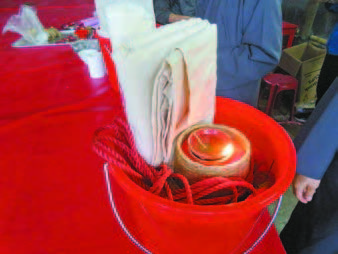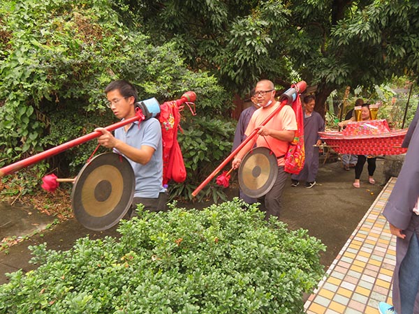神棚內左右高掛兩盞八角形大花燈,寓意為新生男丁開燈。神桌放有一隻生豬、2位新生男丁家庭和8個「神頭」所供奉的果籃及8個紅色米筒。彭慶培說,村內男丁結婚後須在 「神頭簿」登記名字,按序輪流出任神頭協(xié)助儀式進行,一生人只有一次機會,一般等三四十年?,F(xiàn)時紀錄中輪得最快正是他,21歲結婚排到47歲時便任神頭。