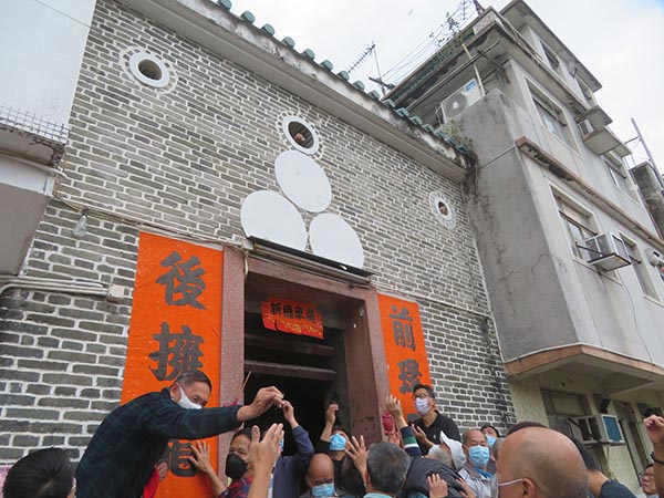 記者見神壇前貼有兩副對聯(lián),正月十五前貼的對聯(lián)為 「曆序新春人傑慶燈逢此日,儺行古禮神靈逐疫應其時」,下聯(lián)中提到 「逐疫」,對抗疫一年多的港人甚有共鳴, 「儺」(粵音挪)是古時迎神驅疫癘的一種風俗,結合上聯(lián) 「新春」、 「慶燈」,全聯(lián)大約意思:適逢新春開燈日,請神明來村中逐疫保佑人畜平安。正月十五當子時一到,便在原有的對聯(lián)位置貼上另一對聯(lián) 「昔年告許洪朝願,今日酬恩答謝神」,開始兩日酬恩的大型朝拜,連串儀式都與祈求子孫昌盛和驅疫除穢有關。