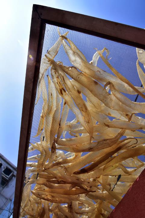漁民婦女在路邊起爐爆炒魚(yú)肚。