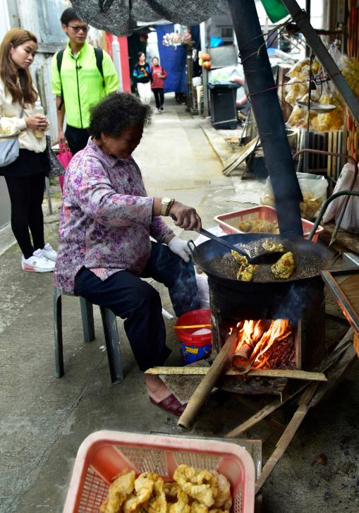 有漁民婦女在門前路邊起爐架鑊,把赤魚(yú)膠爆炒成魚(yú)肚出售吸引了遊人圍觀購(gòu)買。爆魚(yú)肚是漁民傳統(tǒng)做法,目的是要其膨脹鬆脆,浸水發(fā)大後可煮成豬皮口感般的軟滑魚(yú)肚。過(guò)去曾以油炸久放易有變壞的油膉味,故現(xiàn)以鹽爆加工,只要火勢(shì)控制得宜,每一兩分鐘翻炒一次約20分鐘便可完成。蜑家人和客家人都十分喜愛(ài)吃由門鱔魚(yú)鰾爆成的鱔肚,因?yàn)槠淇晌談e的食材汁液增加美味,加上入口軟滑故老幼咸宜。過(guò)去有大澳漁民愛(ài)在大風(fēng)浪中以延繩排專釣門鱔。