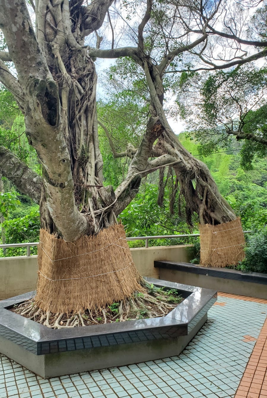 政府用竹或草蓆包裹部分樹幹以捕捉幼蟲。圖為上禾坑村涼亭的榕樹。上禾坑村民提供