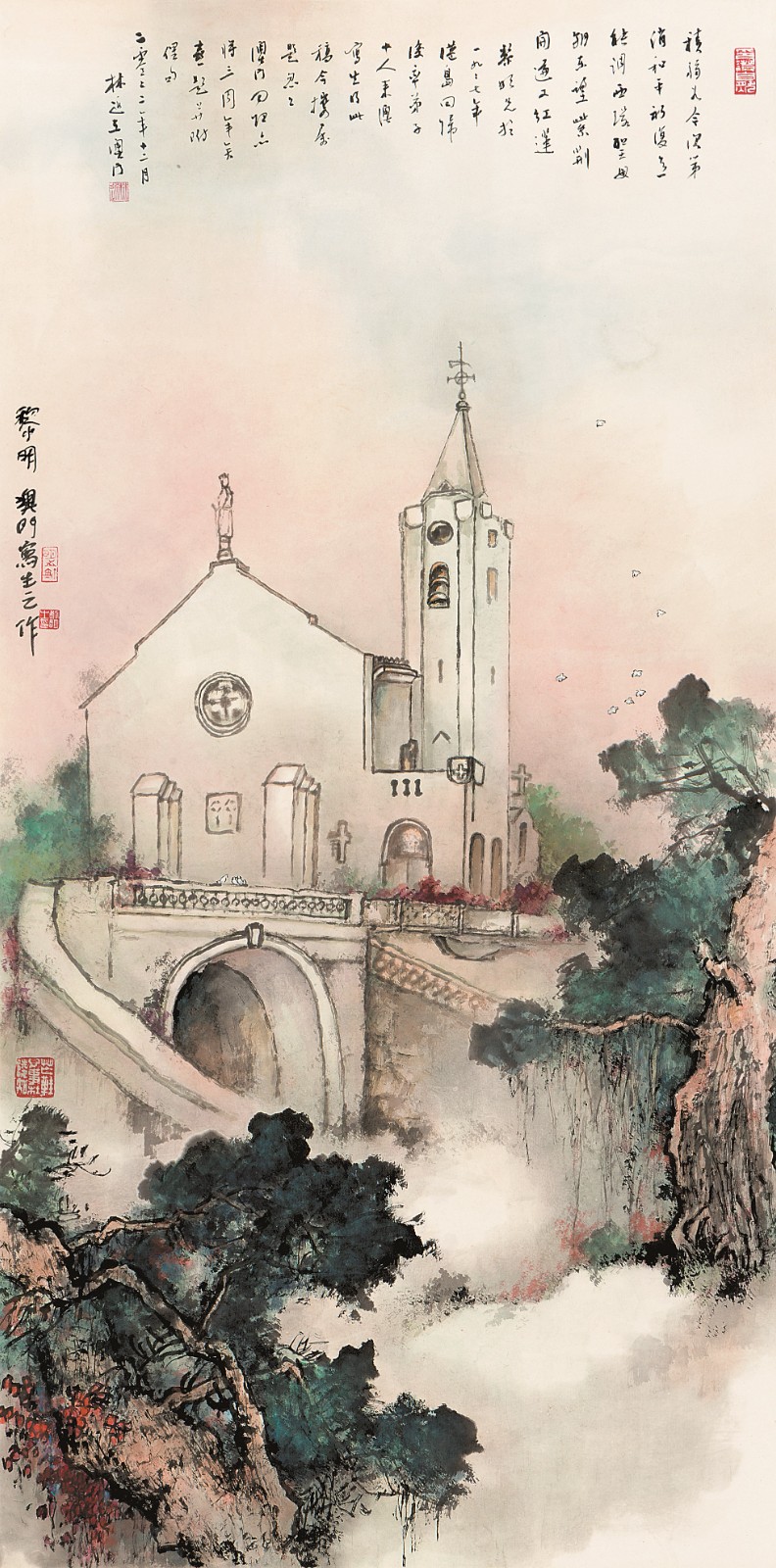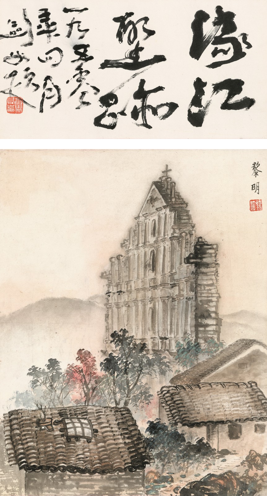 高劍父與黎明合作作品《濠江聖跡》,1950年,62.5×33.7cm。