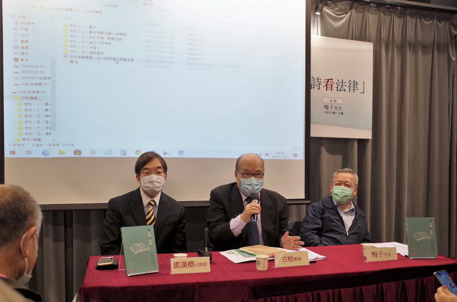 2006年開(kāi)始,古松將閱讀中外小說(shuō)時(shí)思考的法律問(wèn)題,寫(xiě)成系列文章陸續(xù)發(fā)表,其中一部分於2011年結(jié)為專書(shū)《法律與文學(xué)》,備受愛(ài)書(shū)人士關(guān)注,2020年出版的《從小說(shuō)看法律》是其續(xù)編。在「從小說(shuō)和現(xiàn)代詩(shī)看法律」講座中他分享不少書(shū)內(nèi)例子:「內(nèi)地也有涉及法律的小說(shuō),如《秋菊打官司》、《包公奇案》等,《紅樓夢(mèng)》賈寶玉與薛寶釵結(jié)婚,究竟這樣的婚姻是否合法。西方小說(shuō)蘇聯(lián)德羅茲特的《女法官與男囚犯》探討法官的持平態(tài)度、東野圭吾的《彷徨之刃》探討法律是幫助好人抑或壞人等?!构潘芍敝连F(xiàn)在也持續(xù)研究文學(xué)與法律,並將文章發(fā)表在《城市文藝》,希望幫助讀者認(rèn)識(shí)法治。 (記者、攝影:Janice)