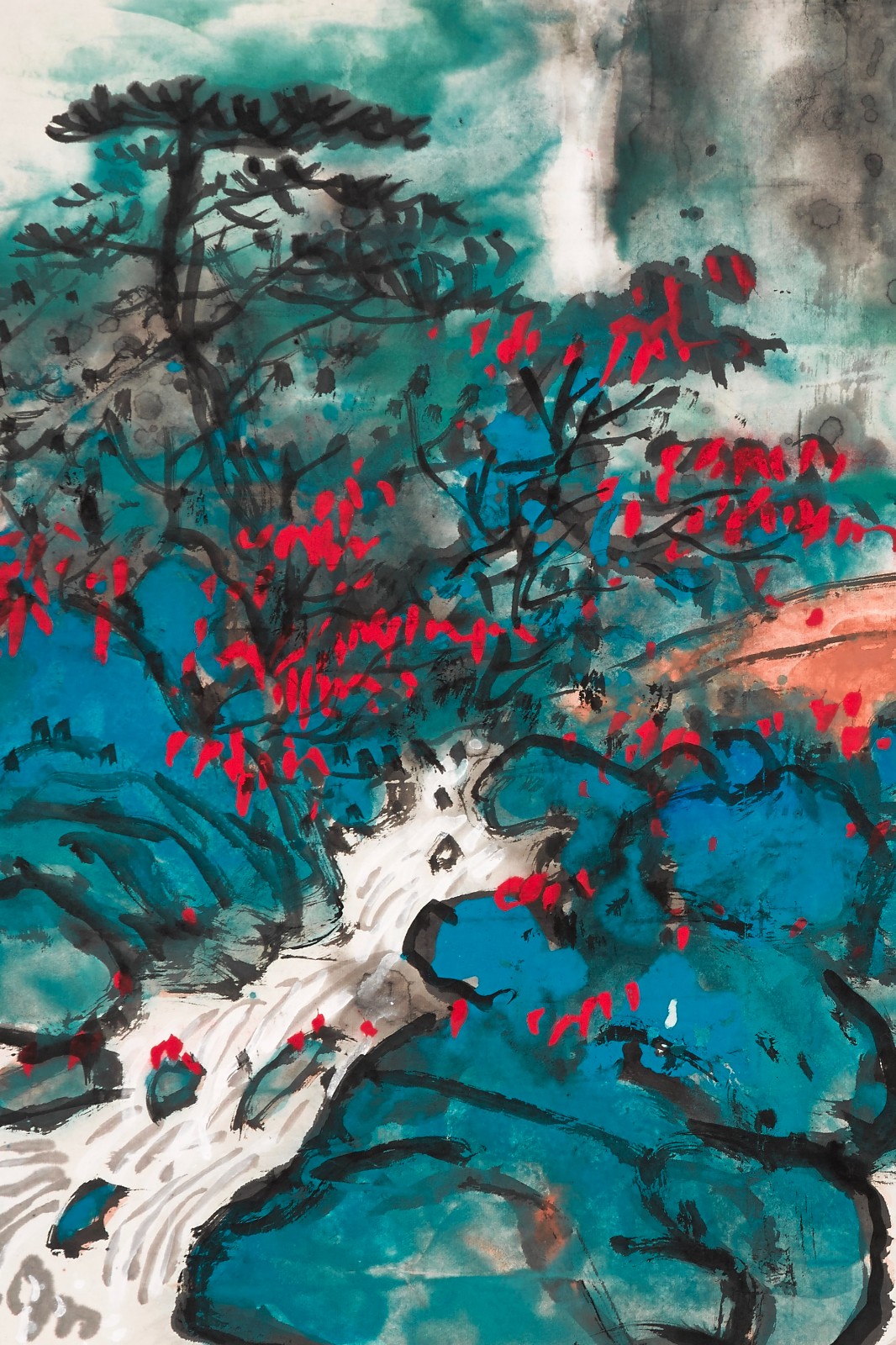觀劉海粟之黃山圖,其奇、險(xiǎn)、妙、趣,皆躍然紙上。此畫為黃山白龍?zhí)?,畫家用揮灑的水墨表現(xiàn)出似真似幻的整體氣象,又以局部勾染點(diǎn)彩著力刻畫出奇松怪石的特色景象,另以淡墨勾畫瀑布激流,一動(dòng)一靜,虛實(shí)相生,給人以幽深怪險(xiǎn)之感。在色彩運(yùn)用上,劉海粟重視直覺與靈感,追求色調(diào)的自然靈氣和天趣。他筆下的色彩鮮活靈透,極富生命感,不拘泥於自然物象原本的色彩,以青色點(diǎn)染石塊,渲染出幽谷的清冽感,山間縈繞青色的雲(yún)霧營(yíng)造出了奇異的氛圍;朱紅暈染橋樑,間或點(diǎn)綴紅色花葉,又為畫面增添活力和激情。得益於畫家本人的直覺與靈感,劉海粟筆下之黃山雄奇壯美、天趣妙成,正如其自我感懷中所道:「光怪陸離真似夢(mèng),泉聲雲(yún)浪夢(mèng)如真」。