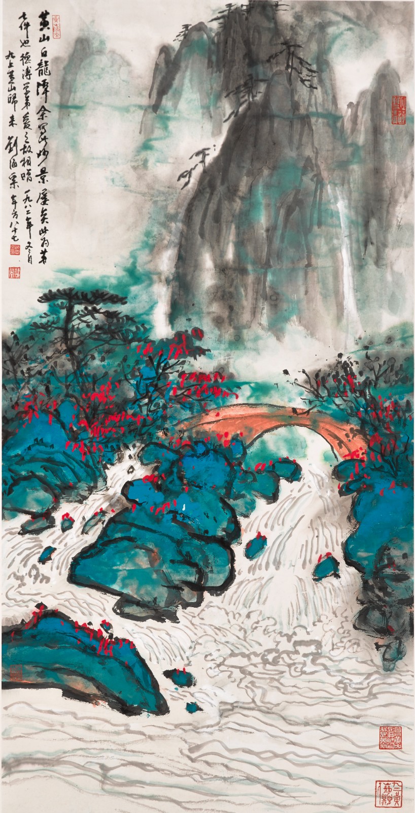 劉海粟作品《黃山白龍?zhí)丁罚?982年,設(shè)色紙本,137×69cm。