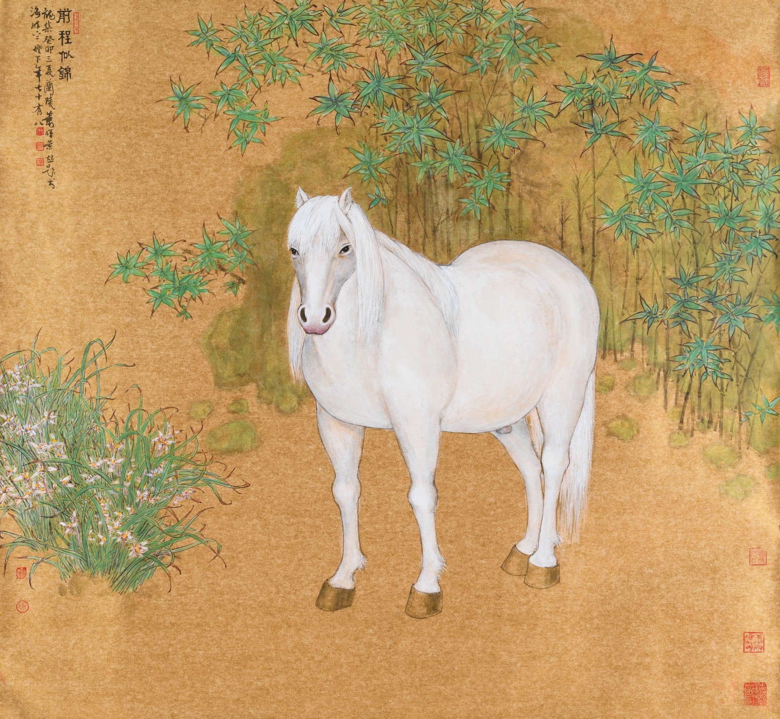 蕭教授畫馬以白描為主,細(xì)筆勾勒輪廓,神態(tài)生動(dòng)自然,毛髮纖毫畢現(xiàn),表現(xiàn)出強(qiáng)烈的寫實(shí)風(fēng)格。細(xì)節(jié)的塑造上以淡彩層層暈染來表現(xiàn)肌肉的起伏,將駿馬渾圓壯碩的體態(tài)描繪得惟妙惟肖。在《前程似錦》中,駿馬前足分開,後足並立,目光直視前方,威風(fēng)凜凜的氣勢(shì)躍然紙上?!盖俺趟棋\」,意為前程似錦繡一般,形容前途十分美好,未來可期。此圖以駿馬象徵飛黃騰達(dá),前途無量。背景中的竹石挺拔俊秀,襯托出駿馬的雄健剛毅,而左下角的一簇蘭花與靜立的駿馬相得益彰,表現(xiàn)出君子如蘭的內(nèi)斂品質(zhì)。