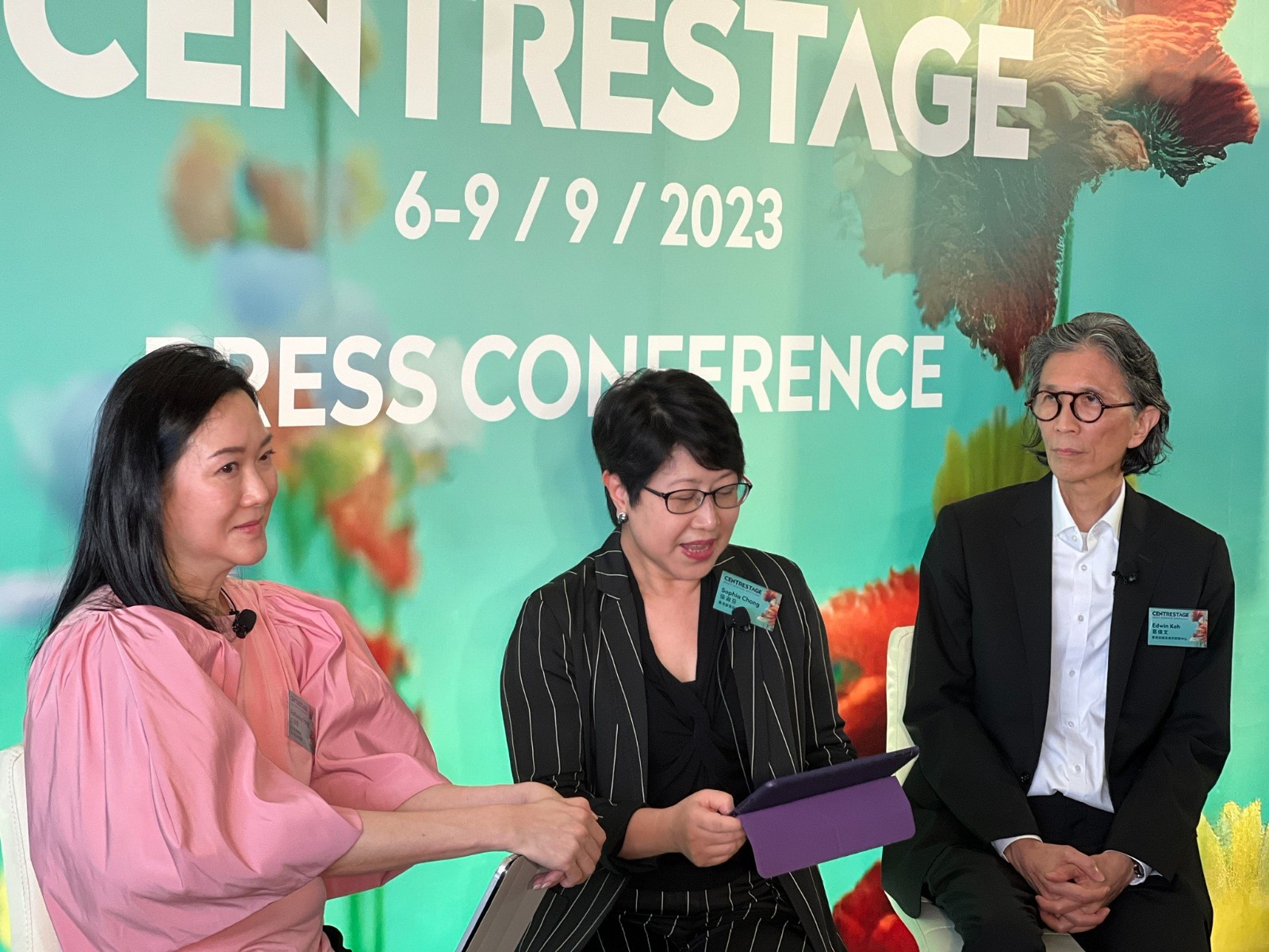 香港貿(mào)發(fā)局署理總裁張淑芬(中)、香港貿(mào)發(fā)局成衣業(yè)諮詢委員會(huì)主席方淑君(左)和香港紡織及成衣研發(fā)中心行政總裁葛儀文(右)於CENTRESTAGE新聞發(fā)布會(huì)分享展會(huì)亮點(diǎn)和業(yè)界趨勢(shì)。