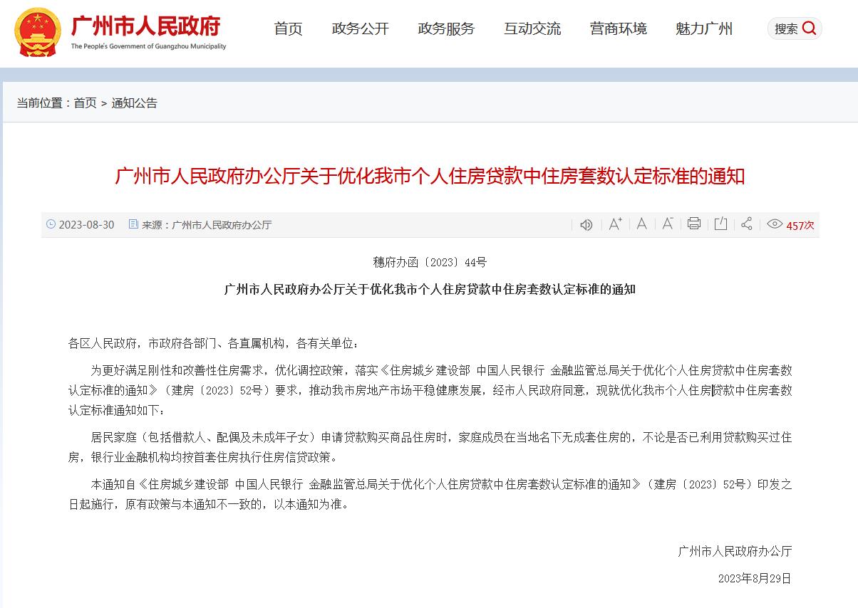 據(jù)廣州市人民政府網(wǎng)站消息,30日廣州市人民政府辦公廳發(fā)布關(guān)於優(yōu)化廣州市個(gè)人住房貸款中住房套數(shù)認(rèn)定標(biāo)準(zhǔn)的通知。