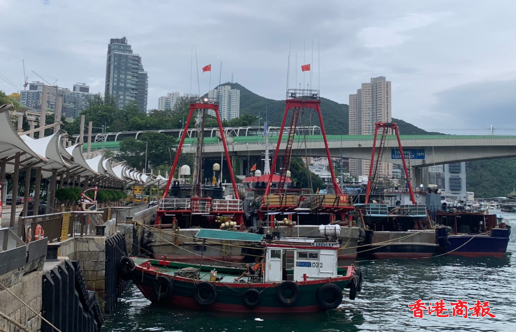 香港仔避風(fēng)塘今午已有不少漁船提前回港避風(fēng),並且整齊排列停靠在岸邊,有漁民已用麻繩將漁船捆綁及固定船身,以防船隻被強(qiáng)風(fēng)吹動。