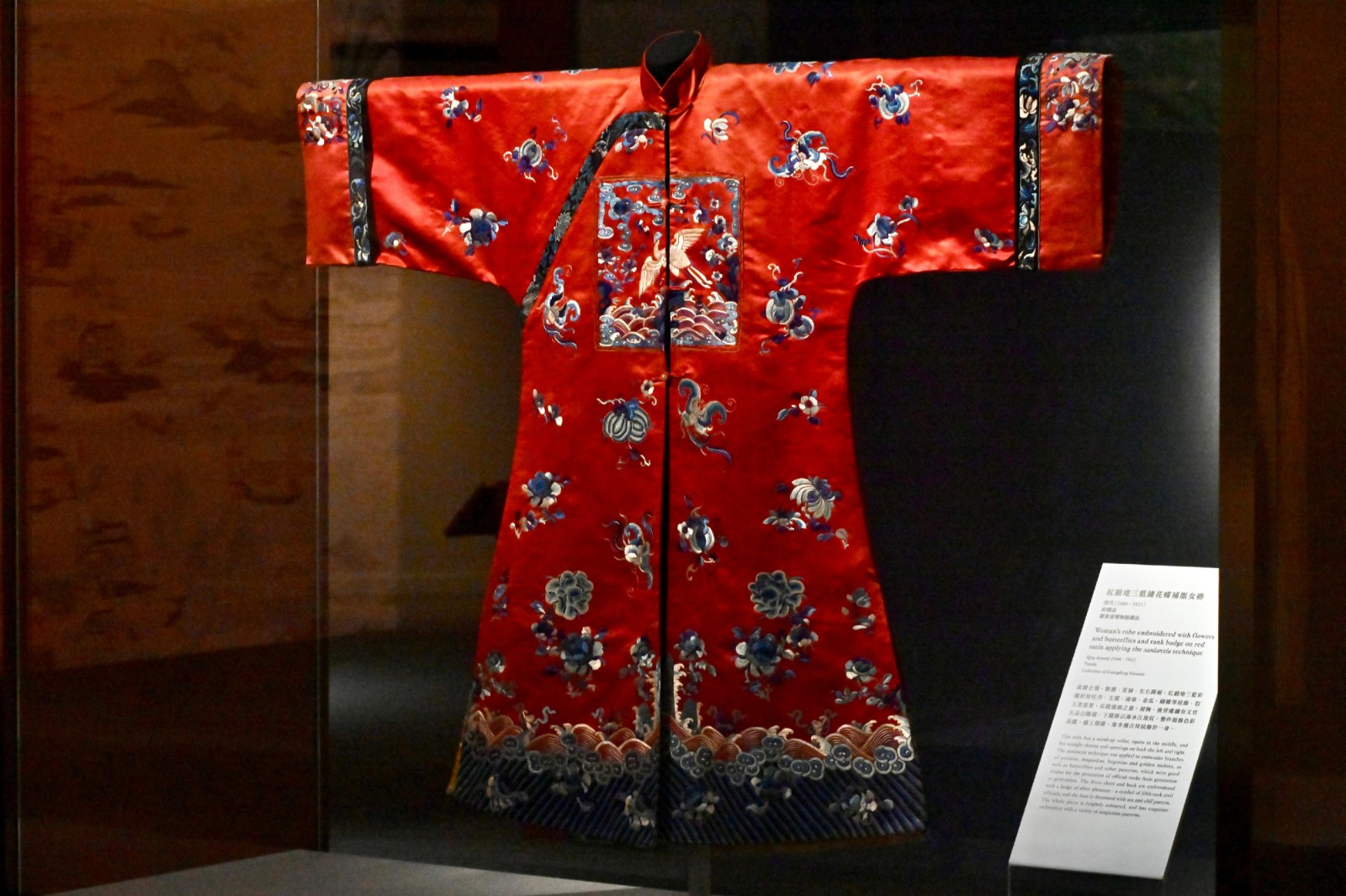 清代紅緞地三藍(lán)繡花蝶補服女褂,為國家三級文物。(廣東省博物館藏品)