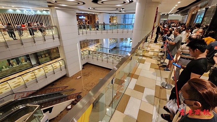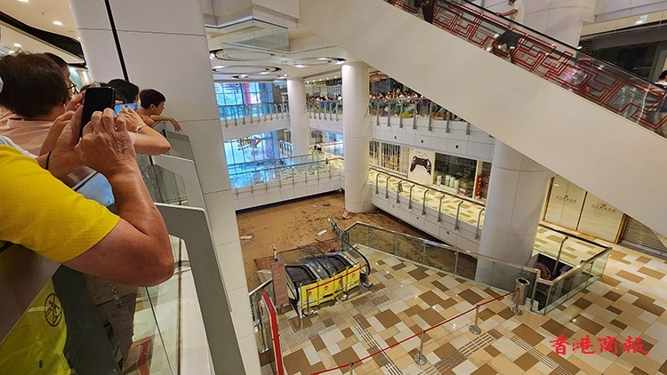 黃大仙中心北館地庫層水浸近乎沒頂,大批市民在商場內圍觀和「打卡」。