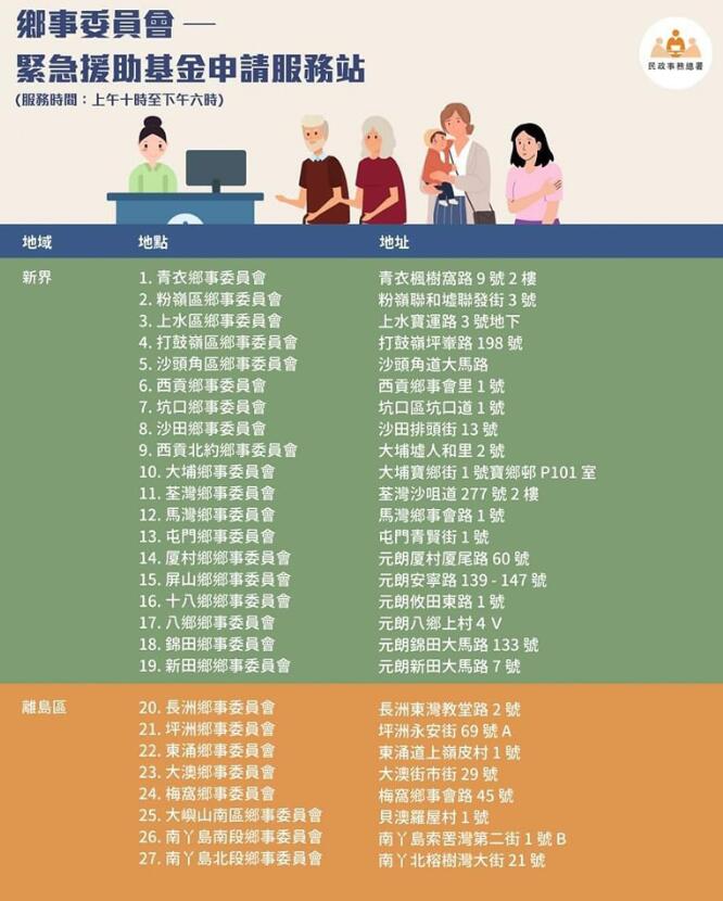 麥美娟指出,政府已經(jīng)委託各個(gè)鄉(xiāng)事委員會(huì)或村代表通知村民,市民若不知道如何申請(qǐng),可以向村代表或村長(zhǎng)查詢,當(dāng)局已設(shè)立47個(gè)站點(diǎn)協(xié)助處理申靖,包括20個(gè)民政諮詢中心及27個(gè)鄉(xiāng)委會(huì)的會(huì)址,政府多個(gè)部門派出100多名人員協(xié)助,包括漁農(nóng)自然護(hù)理署、地政總署、社會(huì)福利署和民政事務(wù)處。