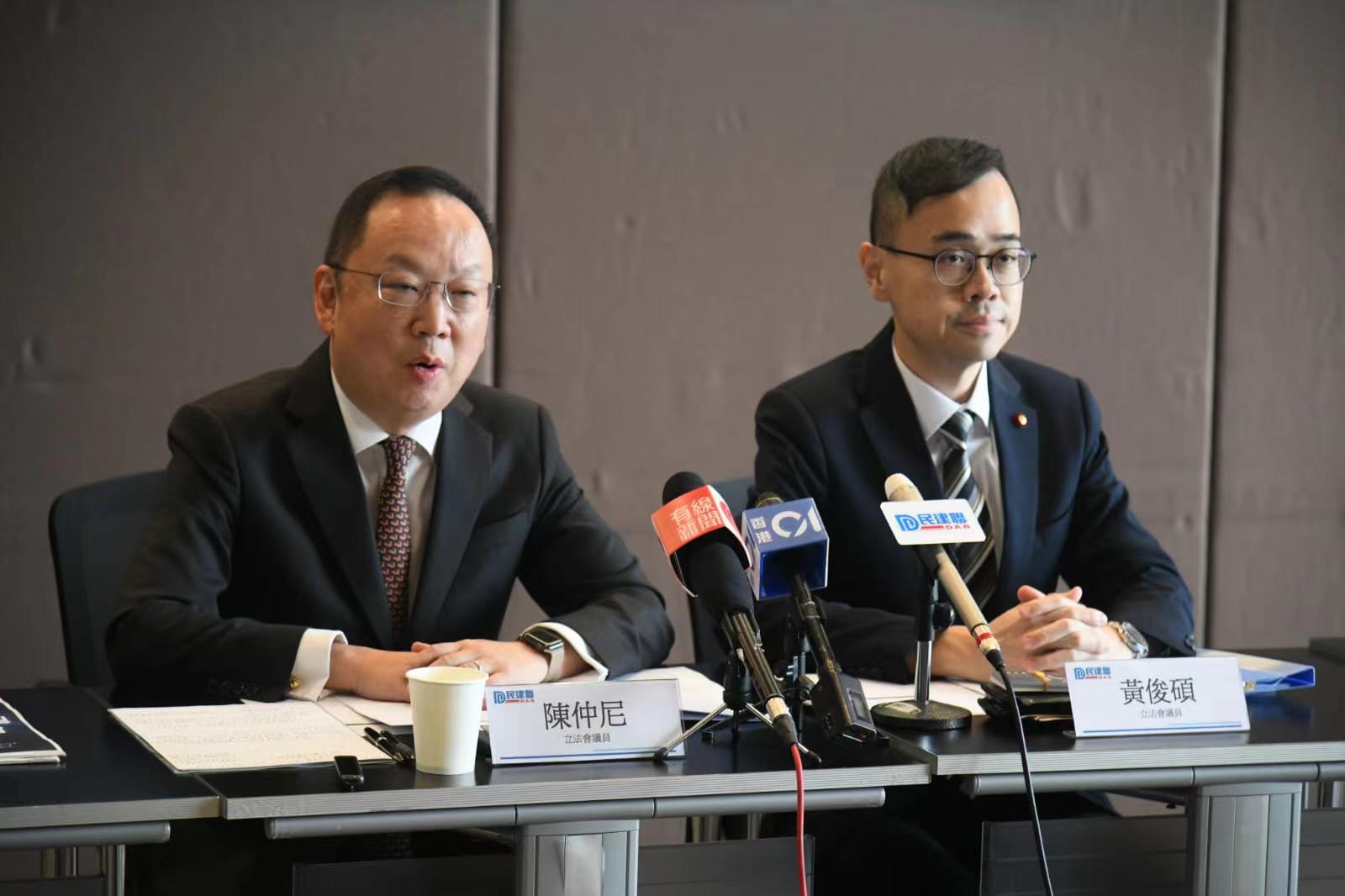 頂圖:民建聯(lián)立法會(huì)議員陳仲尼(左)、黃俊碩(右)今午舉行記者會(huì)。記者 蔡啟文 攝