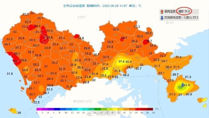 又是「熱晴似火」的一天!昨天(26日)下午深圳氣溫普遍在32-34℃,最高氣溫突破35℃。