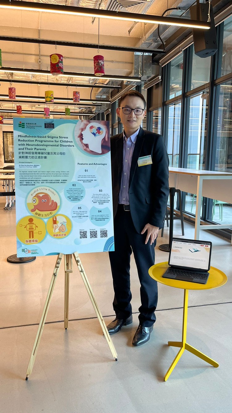 陳家承博士、曹宏業(yè)博士聯(lián)同Edge Development Centre共同研發(fā)的「針對神經(jīng)發(fā)育障礙兒童及其父母的減輕壓力的正念計(jì)劃」;陳家承博士指由於全球?qū)缎睦砘蚓窦膊〖鞍l(fā)展障礙群體的污名問題日益嚴(yán)重,故此與曹博士透過項(xiàng)目開發(fā)正念網(wǎng)上平臺,為神經(jīng)發(fā)育障礙的兒童及其父母提供一系列免費(fèi)及適切的靜觀自我關(guān)懷課程,減輕受惠群眾的壓力及提升心理健康。