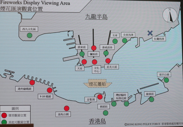 警方會在當(dāng)晚7時設(shè)立封鎖區(qū),包括博物館道、廣東道、九龍公園南行、彌敦道、漆咸道、梳士巴利道和紅磡繞道一帶,並在尖東加連威老道設(shè)立一個臨時巴士站。第二階段在晚上7時30分,尖沙咀西面天星碼頭路段全面封閉,當(dāng)最後一班巴士離開後,當(dāng)中所有停車場或酒店的出入口將無法進出。至晚上9時正進入第三階段封路,彌敦道至佐敦道一段封閉,方便市民觀賞煙花後離開。