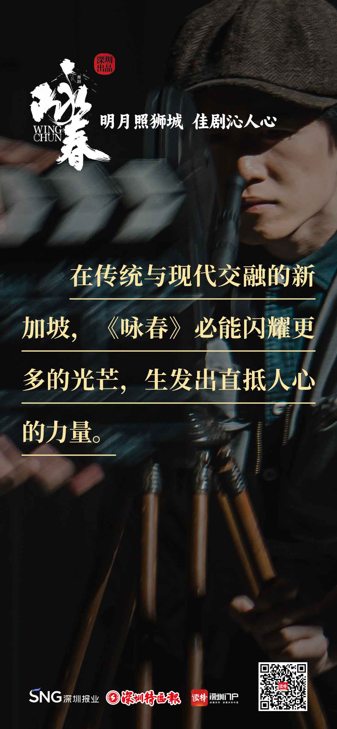 以文化人,更能凝結(jié)心靈;以藝通心,更易溝通世界?!对伌骸芬栽伌喝⑾汶?yún)紗雙非遺為載體,呈現(xiàn)嶺南大地的人文史脈,盡顯嶺南文化的獨(dú)特魅力,串聯(lián)起世界中華兒女的血脈親情。詠春、嶺南、南洋,是聯(lián)繫緊密的關(guān)鍵詞。在傳統(tǒng)與現(xiàn)代交融的新加坡,《詠春》必能閃耀更多的光芒,生發(fā)出直抵人心的力量。