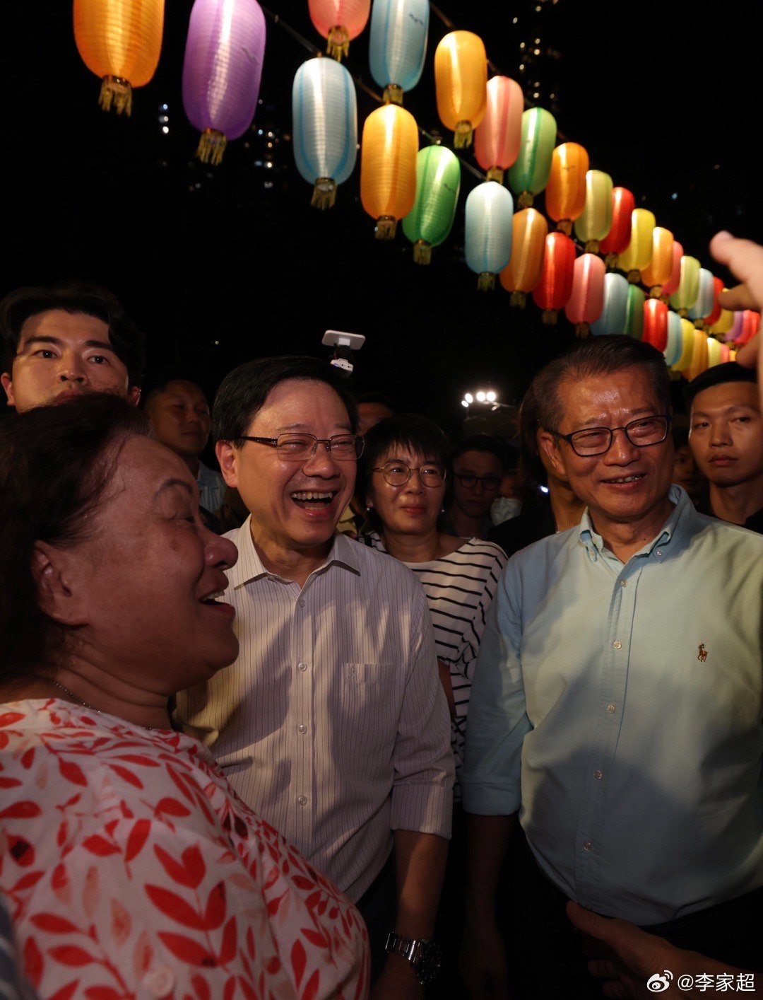行政長官李家超及財政司司長陳茂波,今晚(29日)約9時許到堅尼地城卑路乍灣海濱長廊的中秋夜市視察,沿途與市民打招呼及交談,吸引大批市民圍觀。