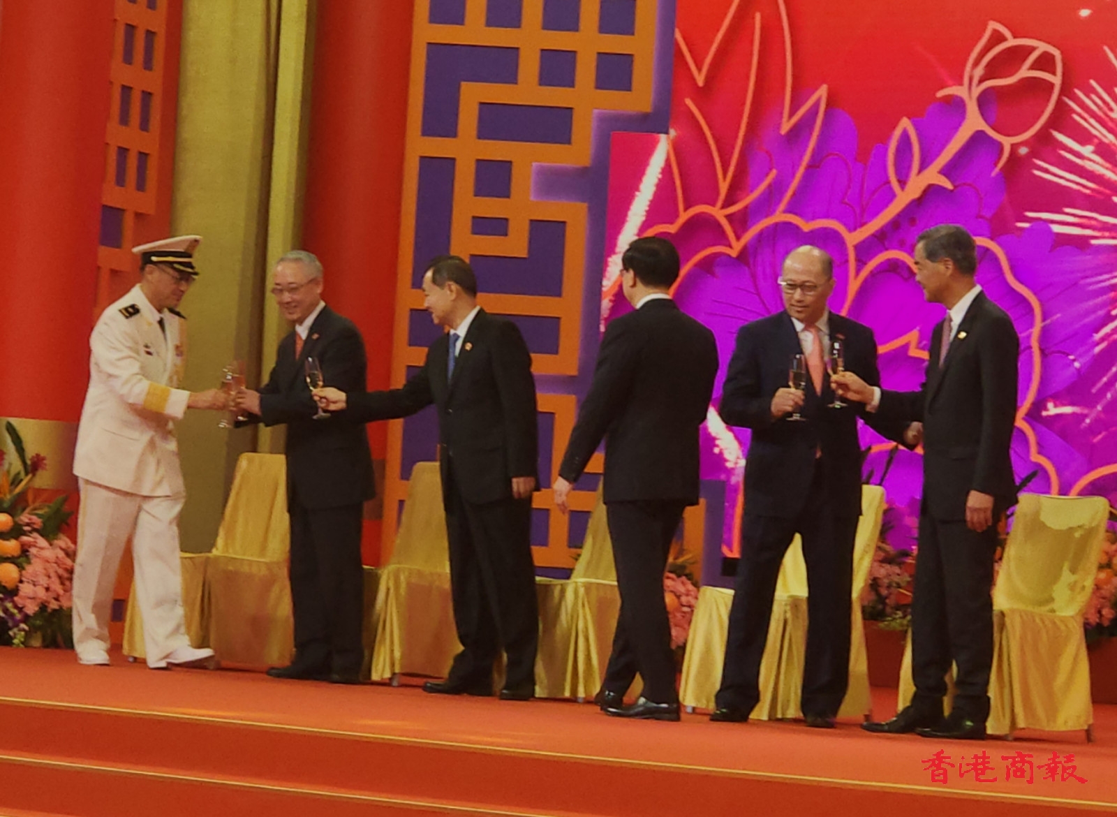 國(guó)慶日,香港舉城歡騰,上午政商各界賢達(dá)齊聚升旗禮和酒會(huì),歡聲笑語。政協(xié)副主席梁振英伉儷更激情高唱《歌唱祖國(guó)》,全場(chǎng)氣氛高漲。