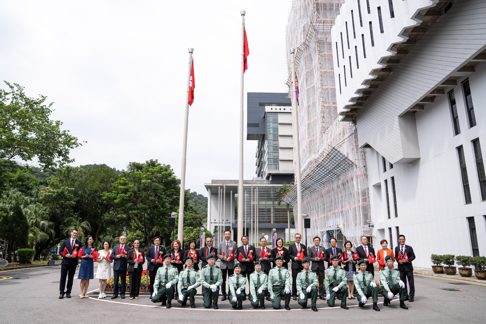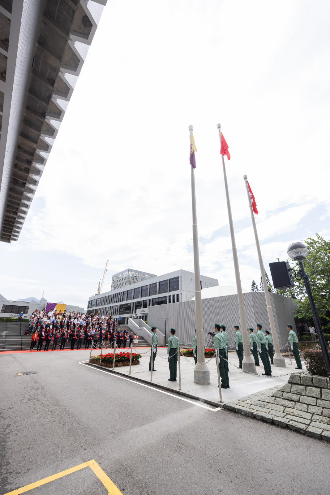 中大很榮幸邀得大學(xué)校董會(huì)主席查逸超教授、校長(zhǎng)段崇智教授、北京市委人才工作領(lǐng)導(dǎo)小組駐港澳人才聯(lián)絡(luò)處執(zhí)行主任王選華先生和副主任常雪瀅女士、中大社會(huì)科學(xué)院榮譽(yù)教授曾鈺成教授大紫荊勳賢,與大學(xué)校董和管理層、書院及學(xué)院代表、大學(xué)教職員、學(xué)生和校友等約160名嘉賓出席升旗儀式。