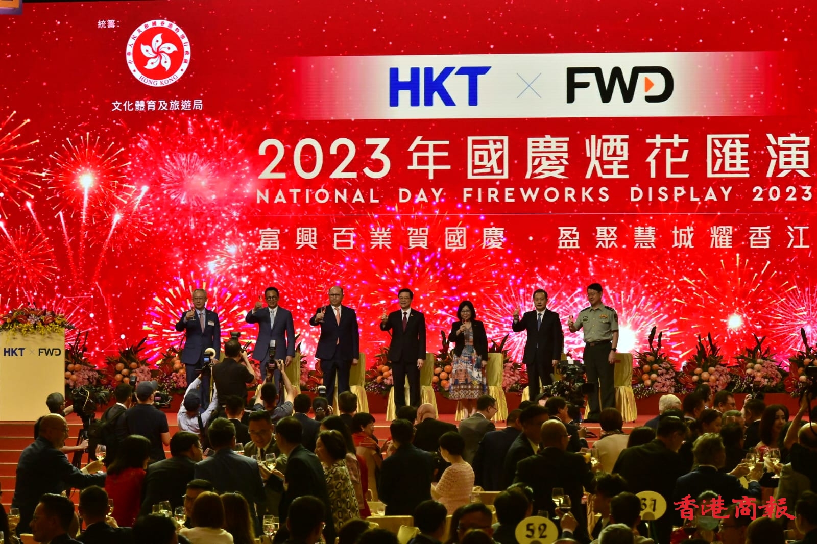 煙花匯演前半個(gè)小時(shí),行政長(zhǎng)官李家超、中聯(lián)辦主任鄭雁雄,中央駐港國(guó)安公署署長(zhǎng)董經(jīng)緯,外交部駐港特派員公署署理特派員李永勝,駐港部隊(duì)副政治委員王兆兵,部分特區(qū)主要官員、中央駐港機(jī)構(gòu)代表等在灣仔會(huì)展出席啟動(dòng)禮。李家超致辭時(shí)表示,今年是5年來(lái)第一次維港大型煙花匯演,象徵香港越過(guò)難關(guān)、全面復(fù)常,踏進(jìn)更美好的未來(lái),而煙花匯演也是「香港夜繽紛」的重頭戲,夜繽紛由政府帶頭推動(dòng),各界熱烈響應(yīng),讓市民旅客感受到香港魅力能帶動(dòng)旅遊餐飲等不同行業(yè)生意。他又稱,已有數(shù)以十萬(wàn)計(jì)的市民和旅客熱切期待今晚煙花,期望各界團(tuán)結(jié)一致,為香港亮麗前景拼搏,為國(guó)家輝煌成就奮鬥。