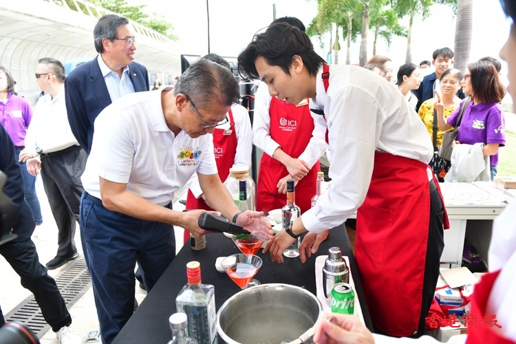 財政司司長陳茂波在「星級料理坊」區(qū)域示範調(diào)配「五感分子雞尾酒」,利用分子料理技巧和科學方法調(diào)製具獨特香氣和煙霧的特飲。