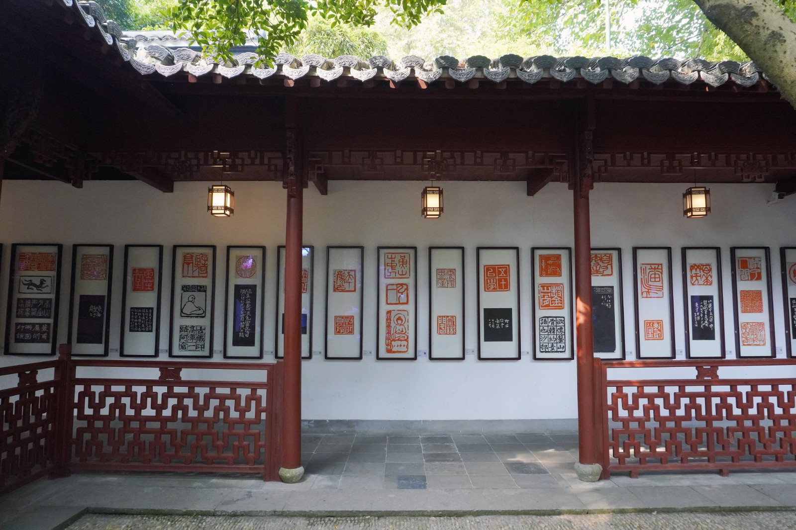 西泠印社印廊裏呈現(xiàn)明清至現(xiàn)代、40位名家的篆刻作品。