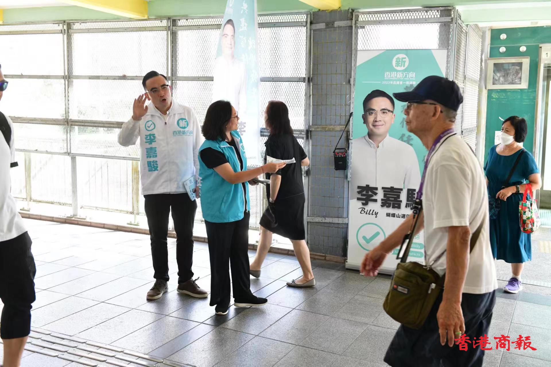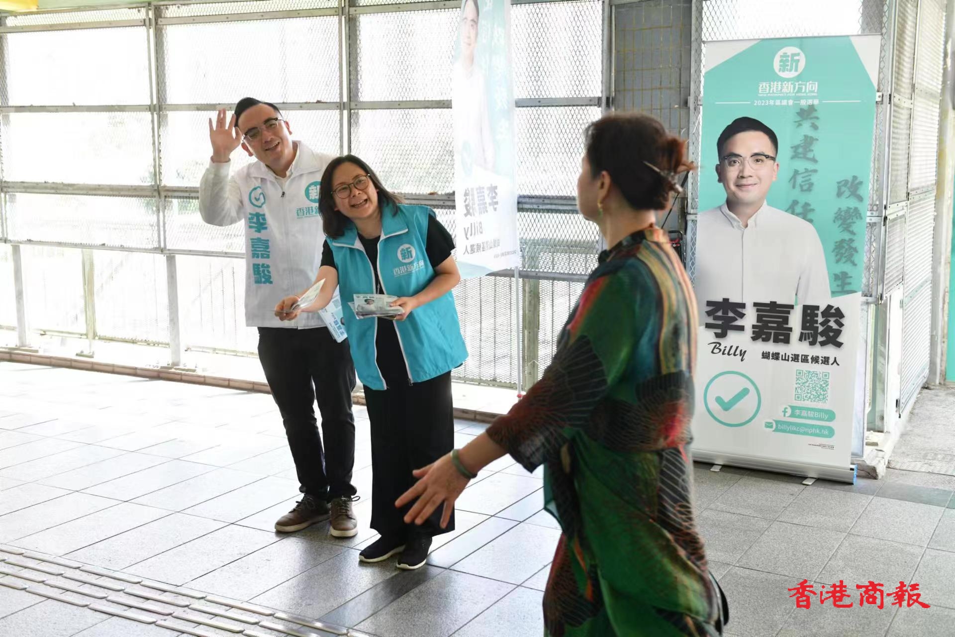 參選2023年區(qū)議會一般選舉蝴蝶山選區(qū)的香港新方向李嘉駿,盡力爭取選民支持。崔俊良攝