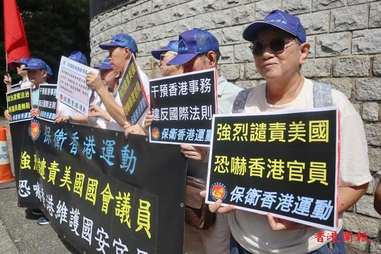 「保衛(wèi)香港運動」今日(5日)到美國駐港總領(lǐng)事館舉行「強烈譴責(zé)美國恐嚇香港維護國安官員」集會。請願人士高叫「強烈譴責(zé)美國恐嚇香港官員 政治凌駕法治 美議員最無恥 干預(yù)香港事務(wù) 違反國際法則 國安法護法治 無懼美國打壓」口號。