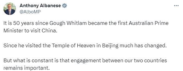 阿爾巴尼斯在社交媒體上發(fā)布了多張參觀天壇的照片,並發(fā)文稱,「50年前,高夫·惠特拉姆成為首位訪華的澳大利亞總理。自從他參觀北京的天壇以來,已經(jīng)發(fā)生了很大變化。但不變的是,我們兩國之間的接觸仍然很重要。」