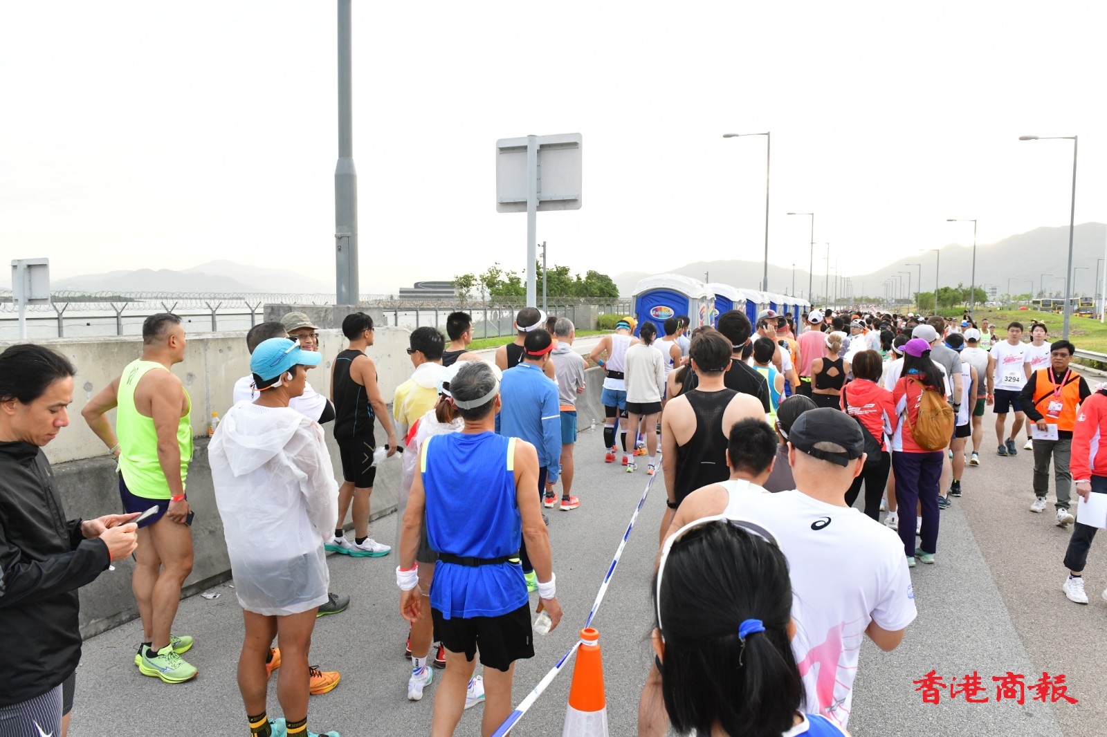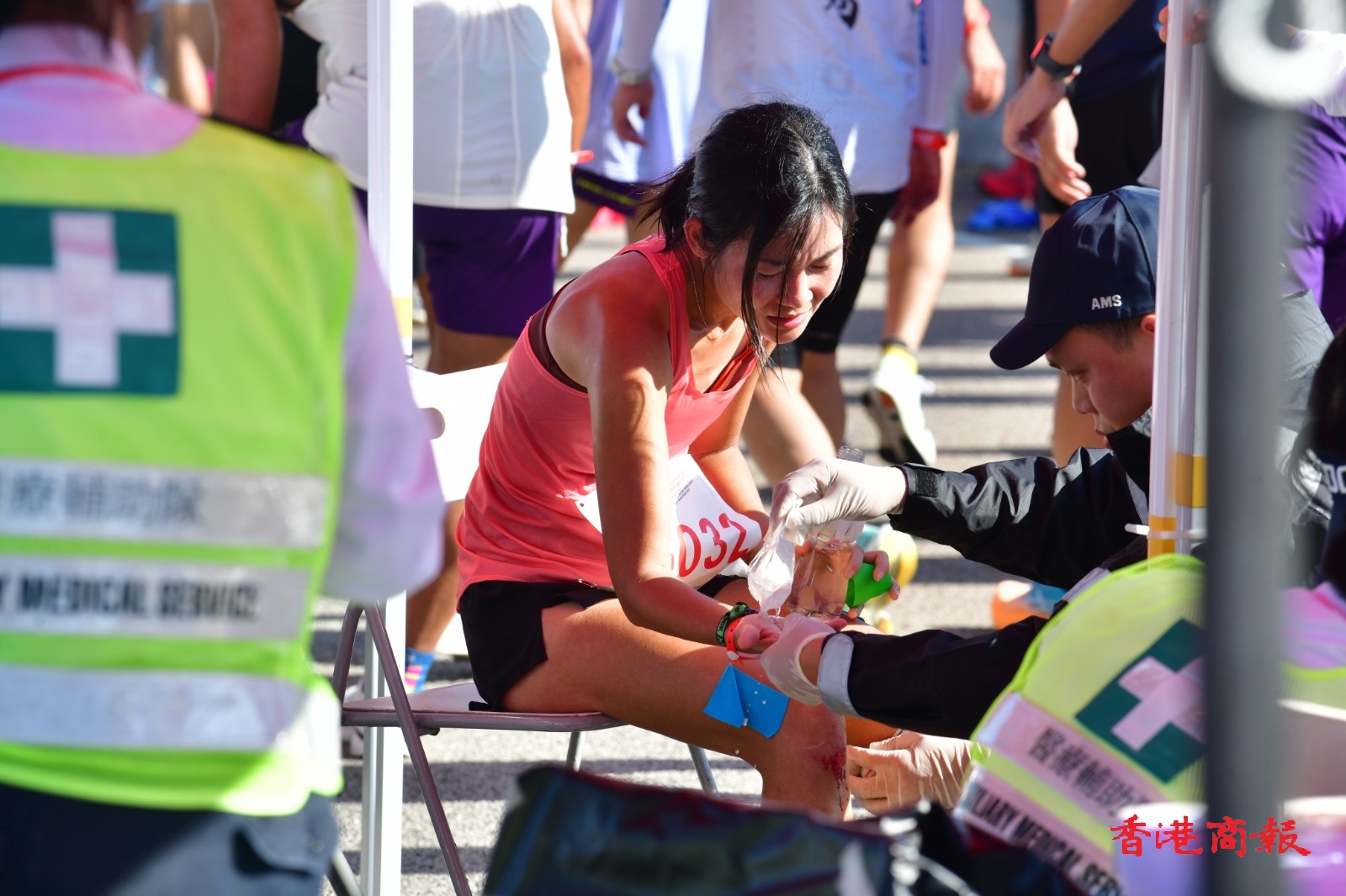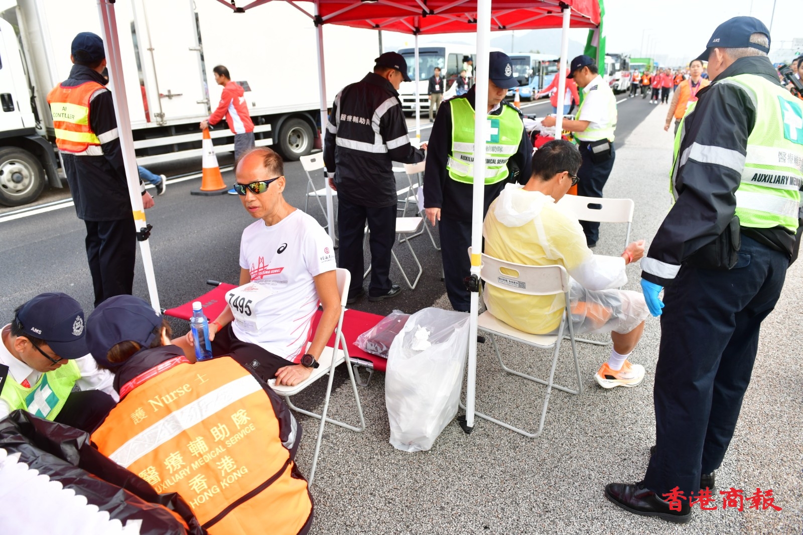 多名跑手不斷做熱身及拉筋,更有多國跑手參賽,頗為熱鬧。今晨天朗氣清,不少跑手都跑得舒服,但有選手不慎跌倒受傷需接受治理。(崔俊良攝)